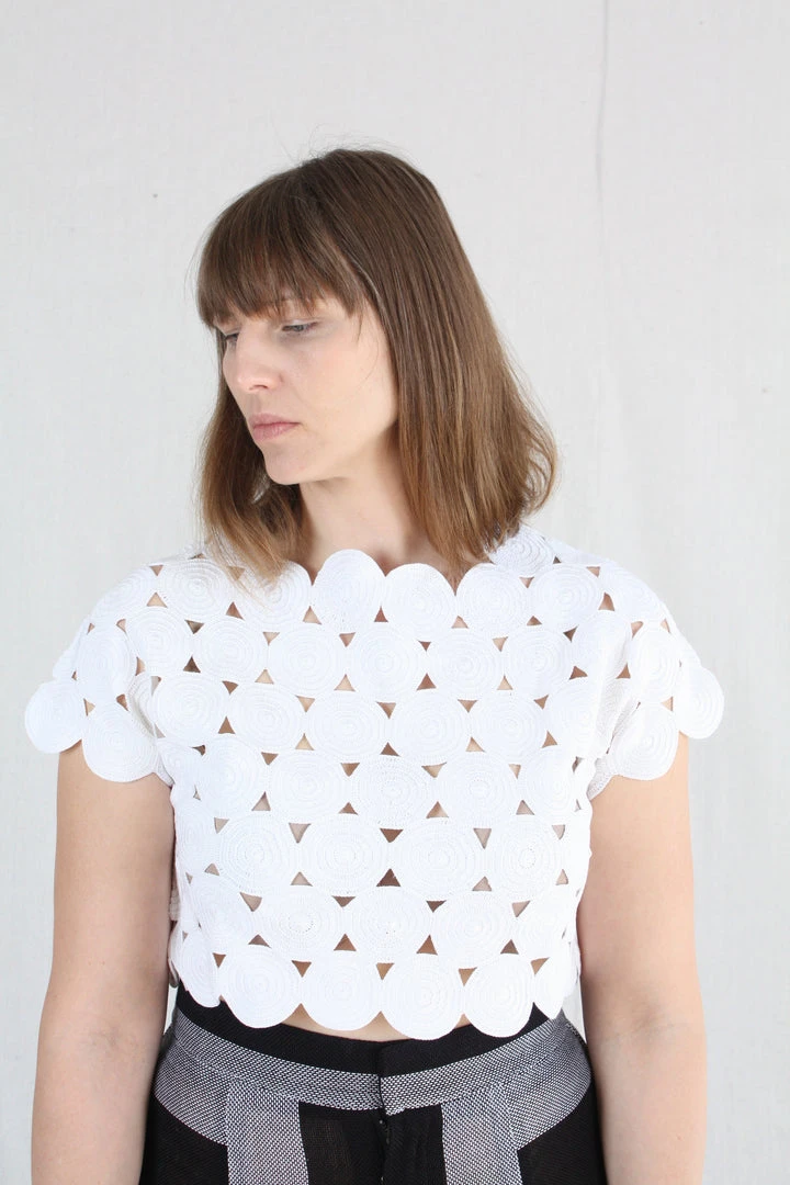 Hand made crochet circles make up this crop tee in optic white. Unlined.