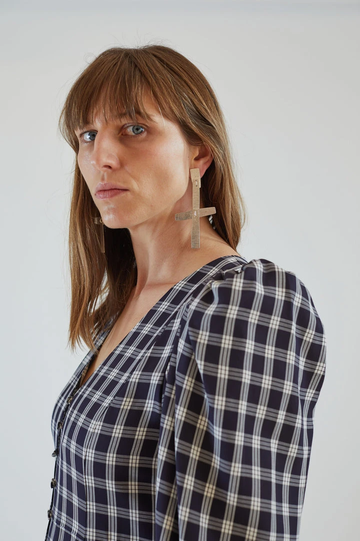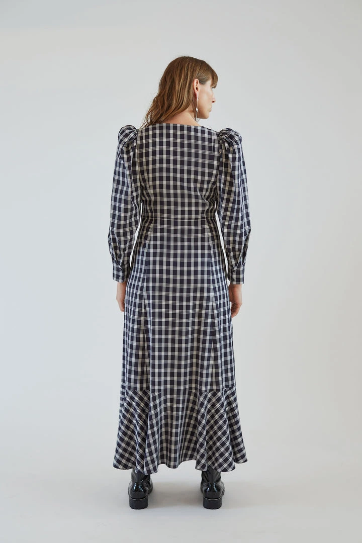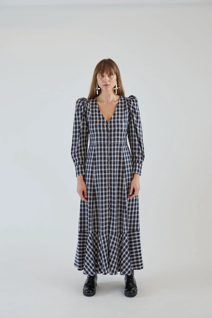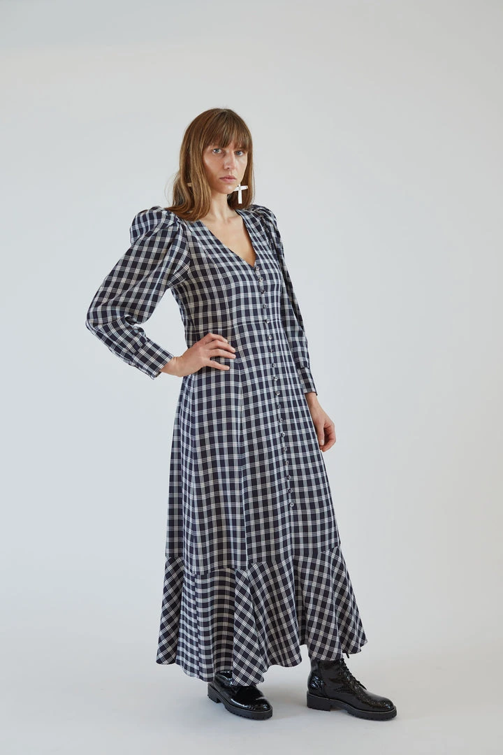 Peasant dress with long, puff sleeves in our Navy Plaid viscose. Deep V neck with fabric covered buttons at front and invisible side seam zipper entry. Shaped bodice, with a relaxed fit. A-line fit skirt. Hits above ankle. Ruffle hem and side seam pockets. Unlined.Â