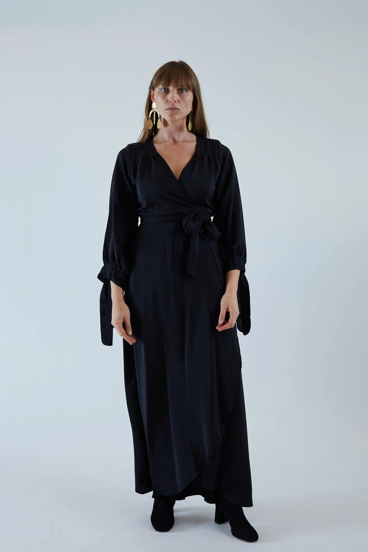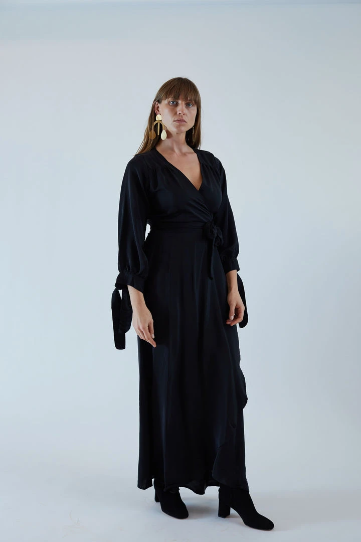 Maxi dress with asymmetrical hemline. Crossover bodice with wrap closure, forming soft gathers at mid section. Voluminous long sleeves with ties.