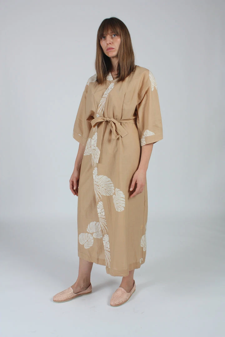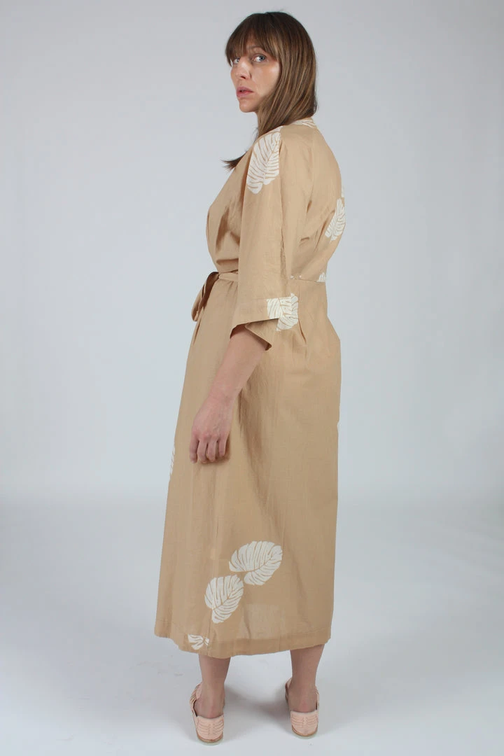 Maxi dress with wrap tie closure. Can be worn as a dress or kimono. Wide 3/4  sleeves.