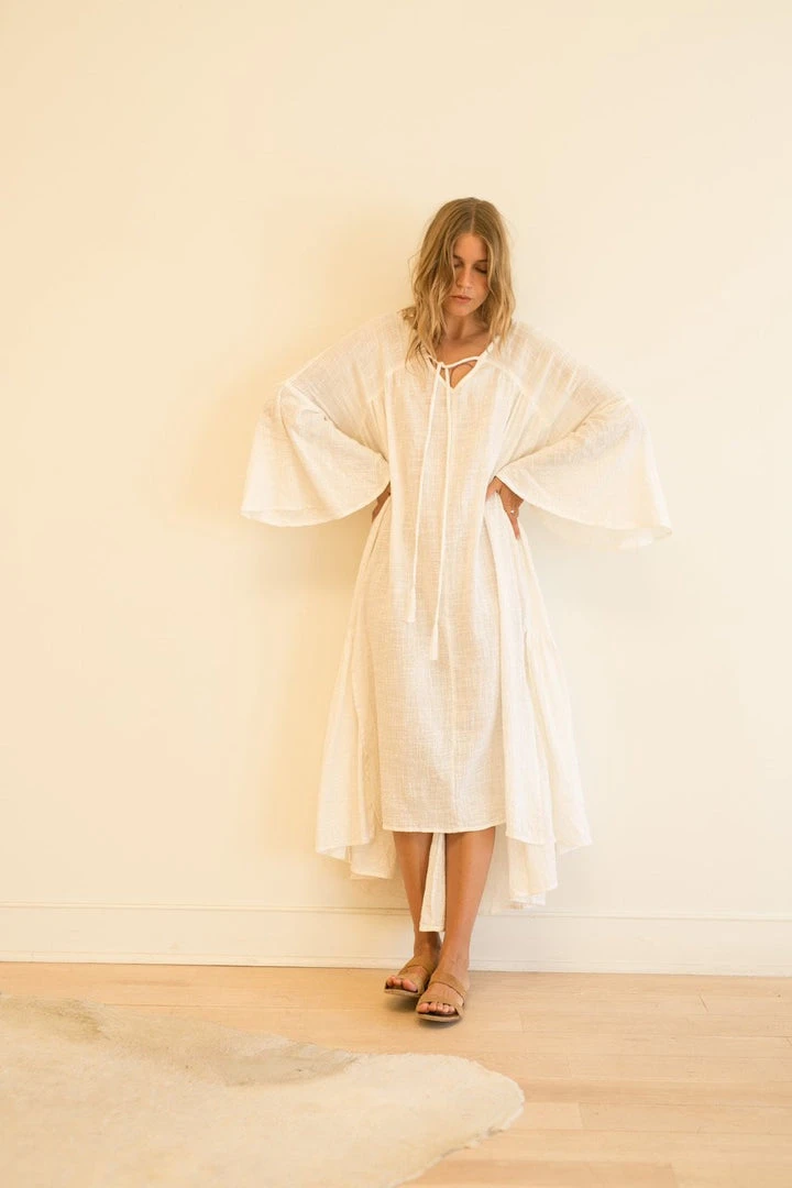 Cotton gauze maxi dress. Bell sleeves. Slits on side hit upper/mid thigh. Tiered back.