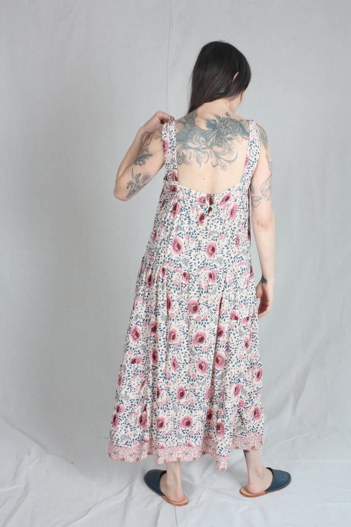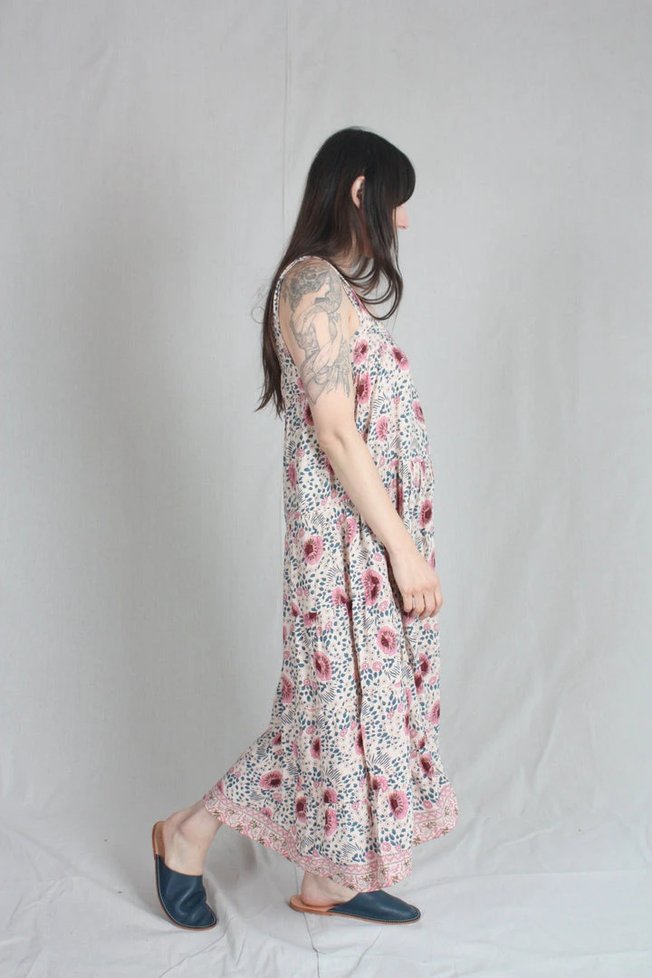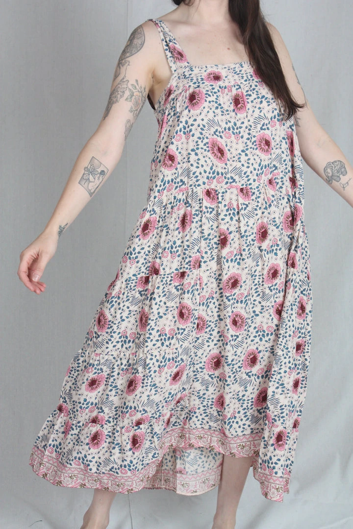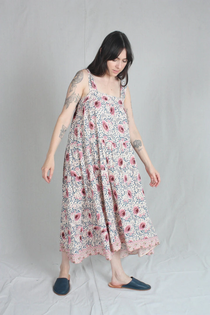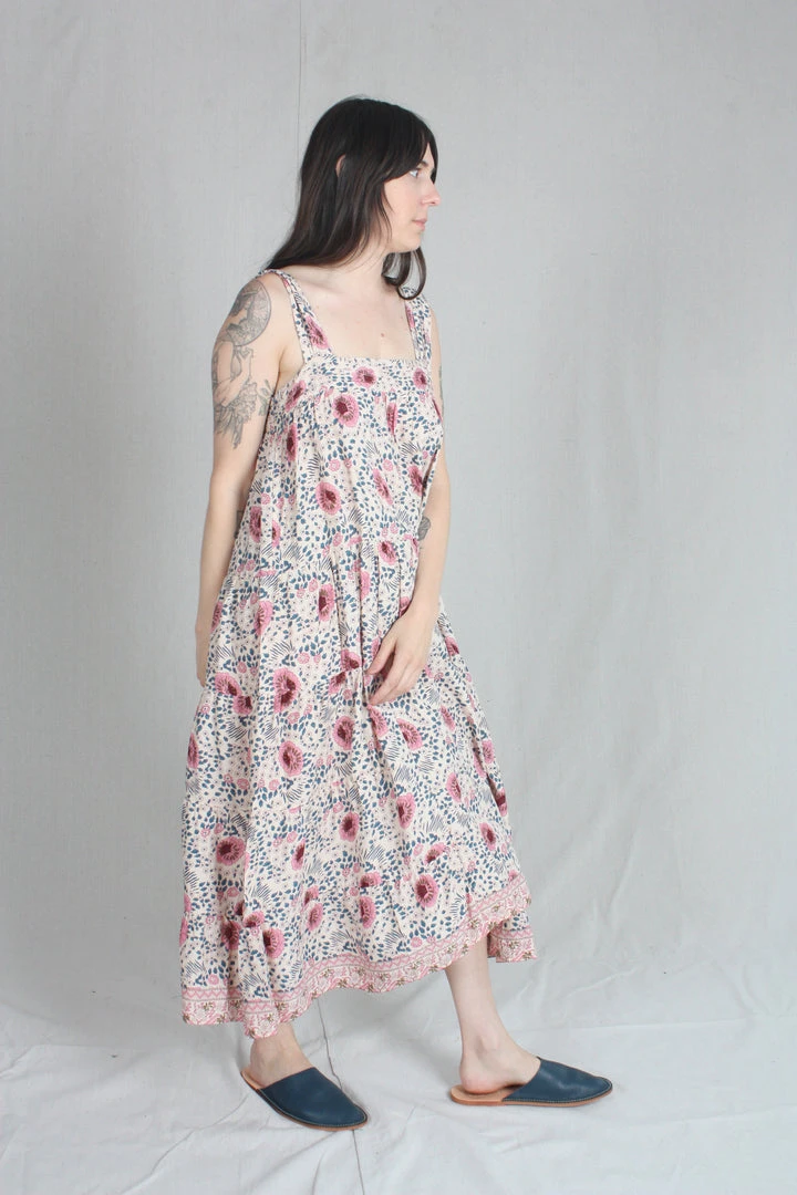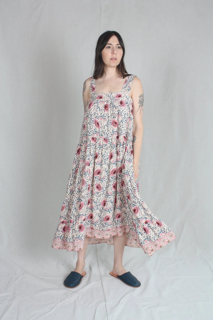 Sleeveless dress with thick strap. Tiered skirt, hits right below the knees to mid-calf.