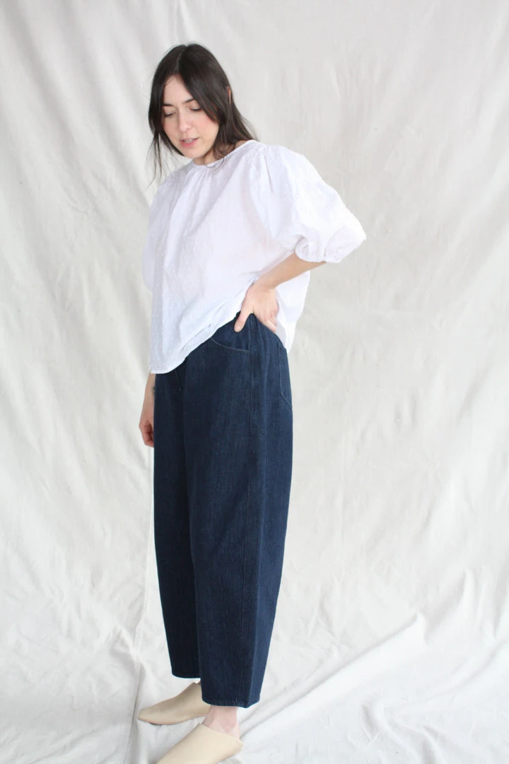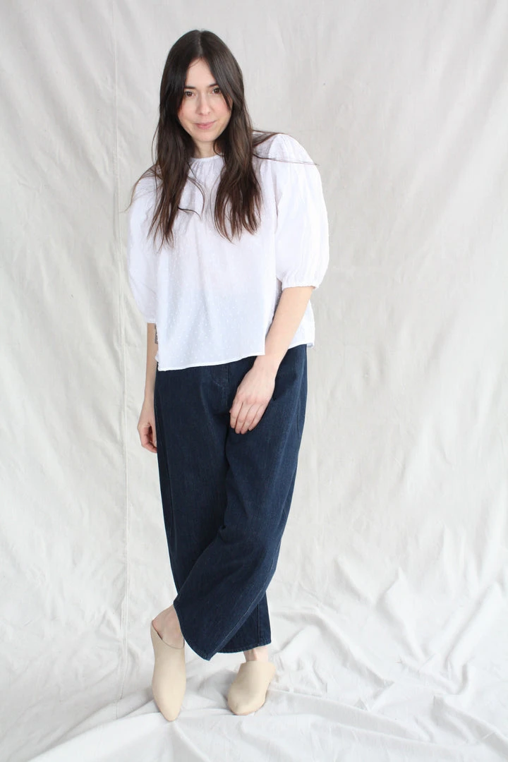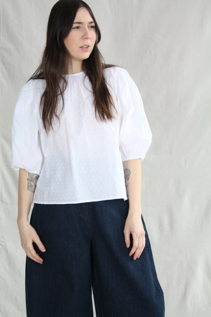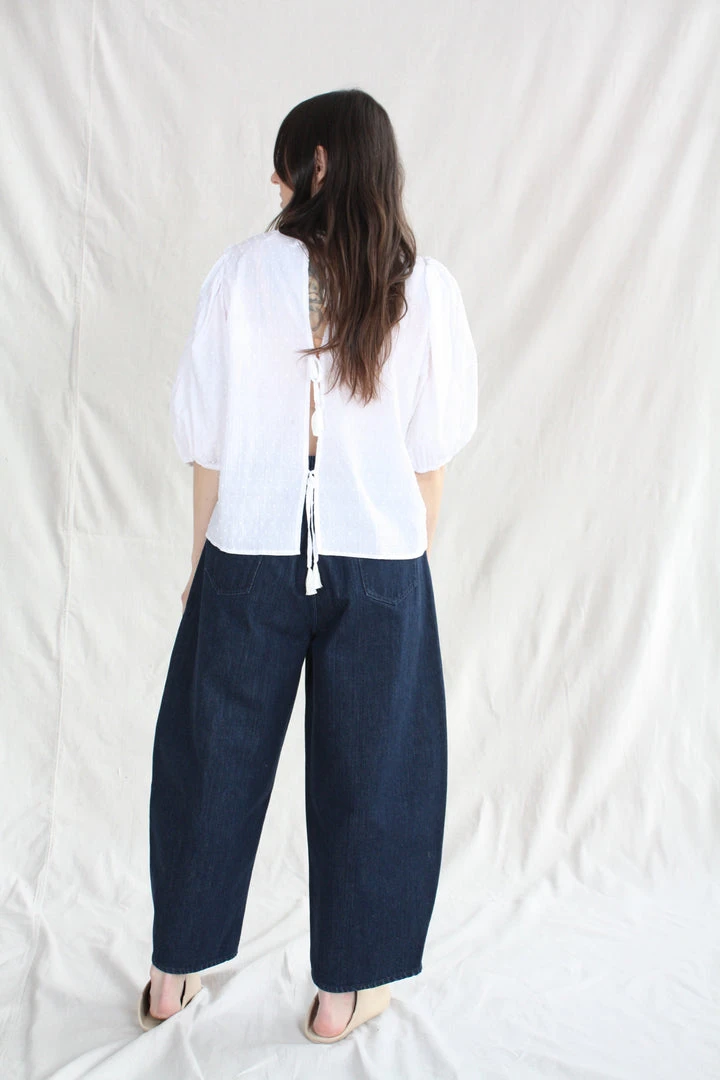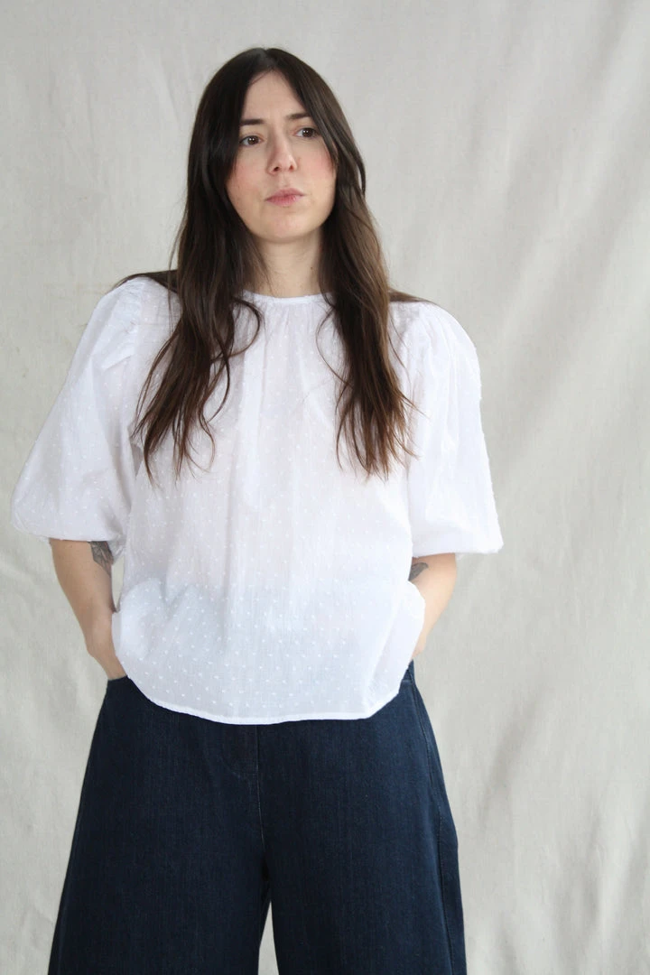 Blouse with ties down the back. Half sleeves with elastic cuffs. Slightly pleated under neckline to add body. Slightly sheer.