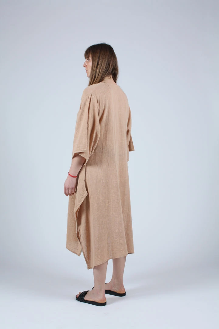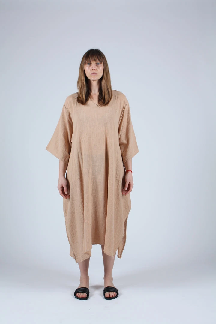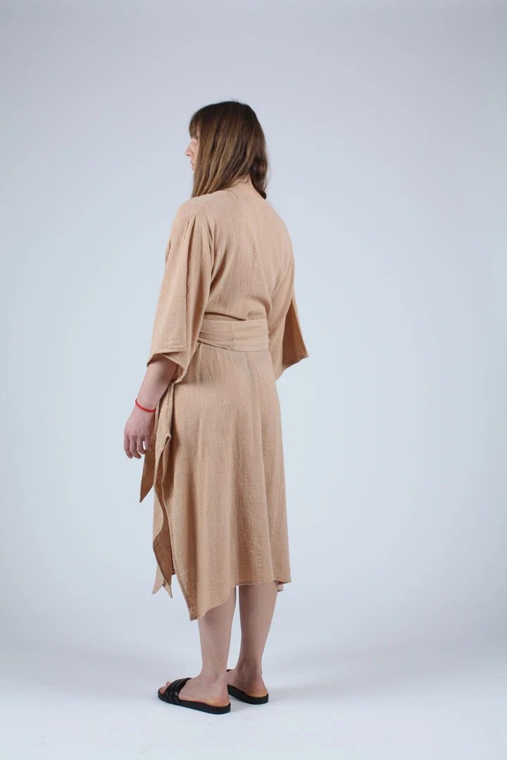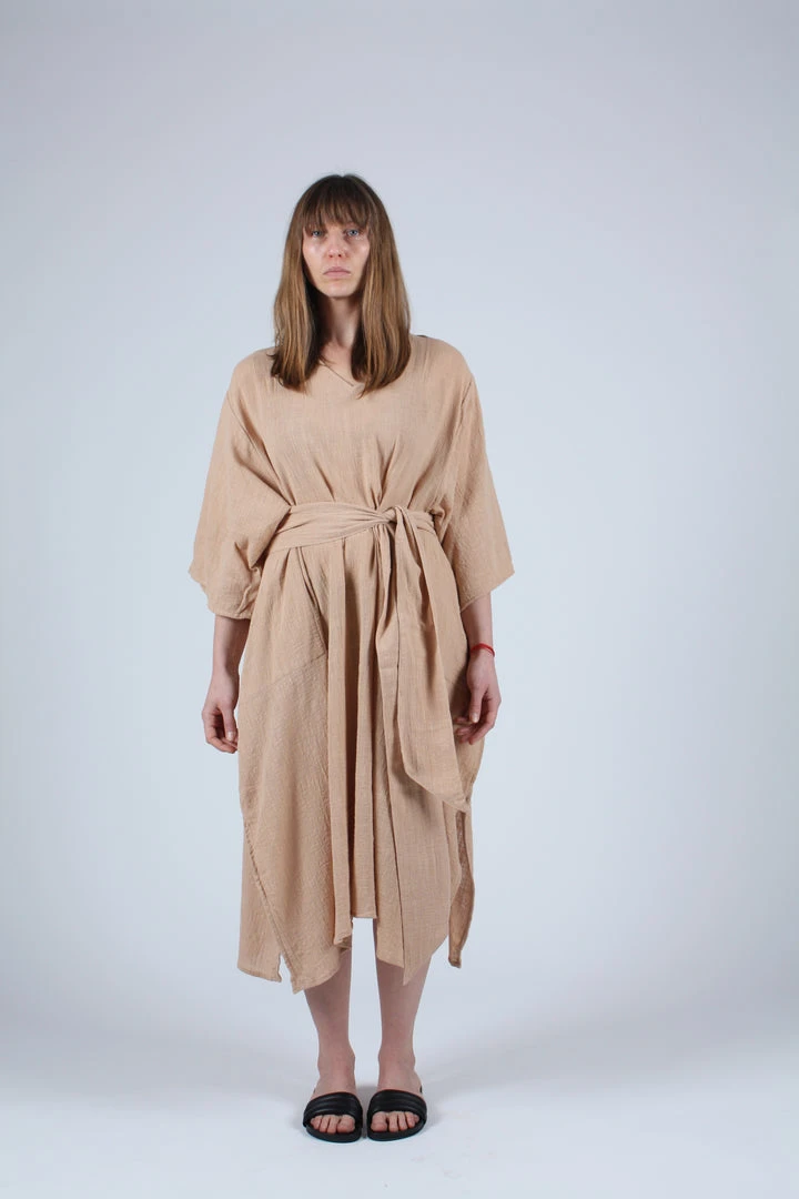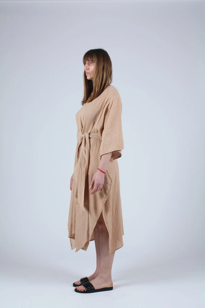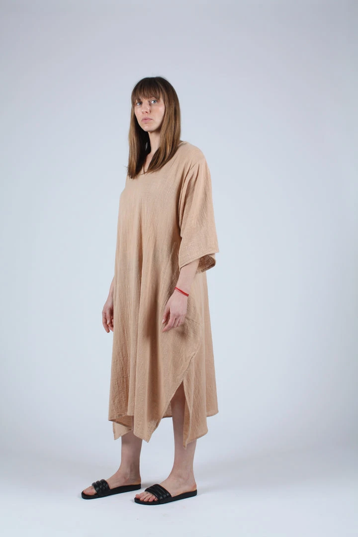 Simple midi dress with v-neck and half sleeves. Side slits hit around the upper thigh. Comes with removable sash belt.Â