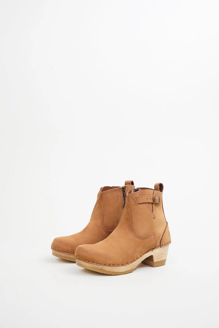 - Water repellant nubuck leather, wood base and polyurethane sole