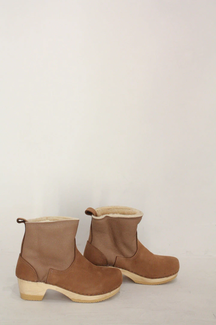 - Water repellant shearling with cow nubuck upper, wood base with polyurethane sole