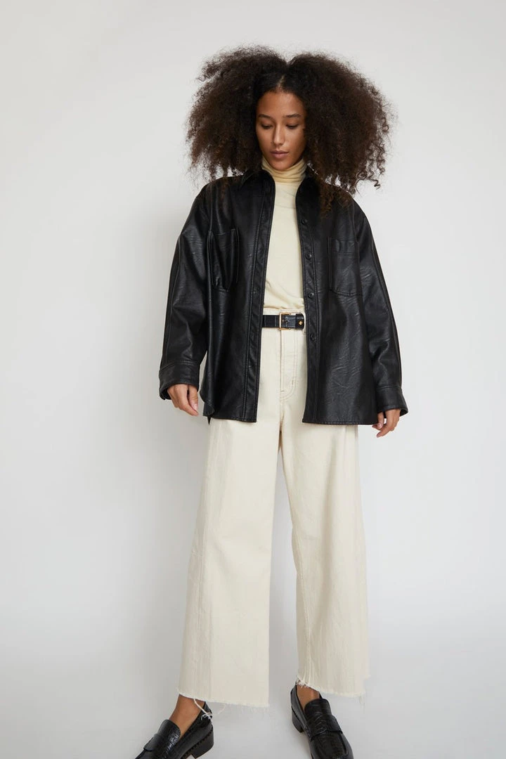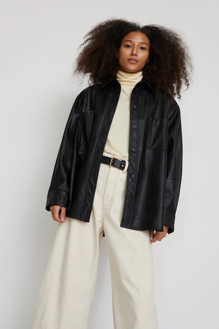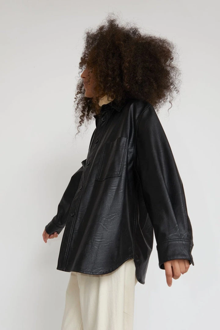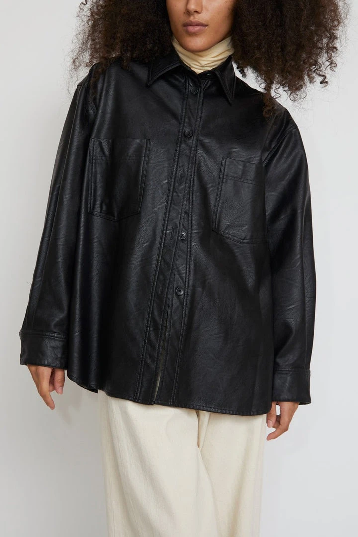 Collared button-down faux leather shirt. Pockets at chest. Slightly oversized, boxy, androgynous fit. Relaxed cuffs. Hand wash cold, hang dry.