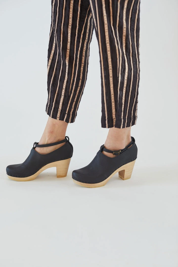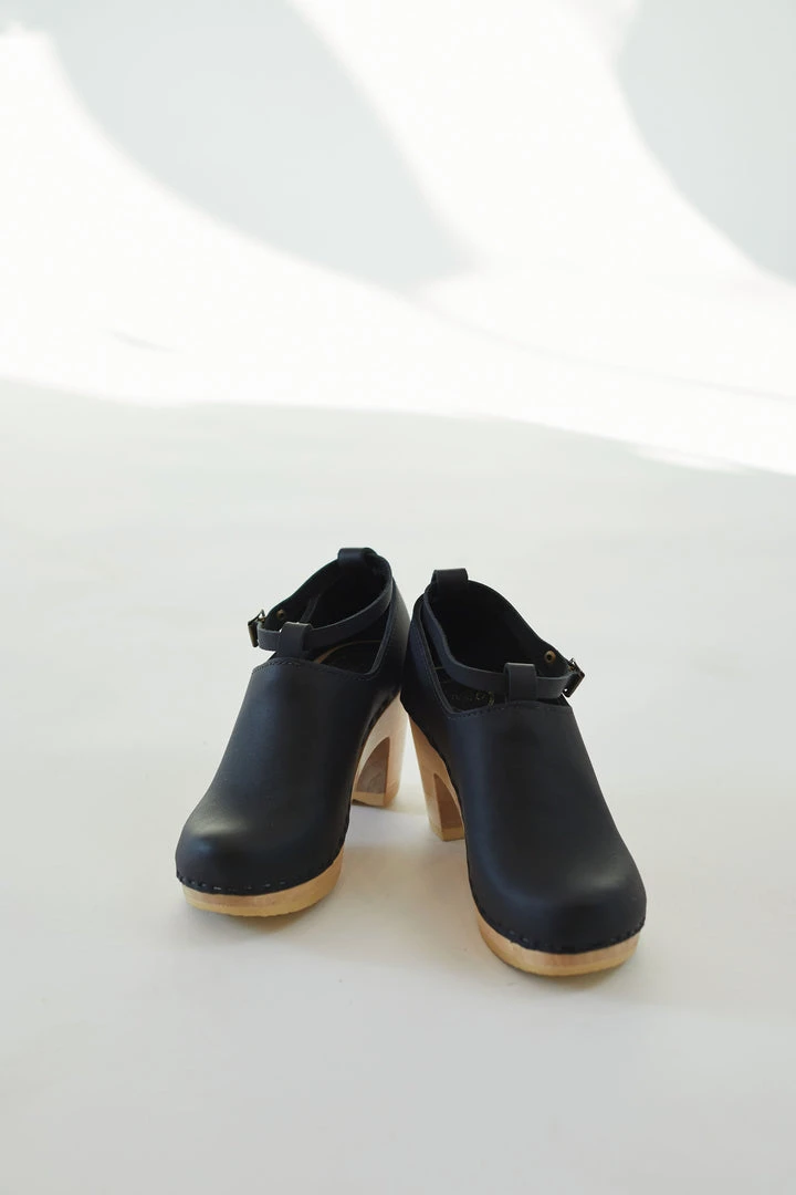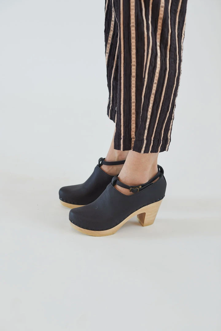 Closed back clog bootie with adjustable ankle strap in black leather. Lacquered high heel base. Slips on. Closed toe. Unlined. Wear with your favorite cropped pants and No.6 socks. As with all of our closed back clog styles, your heel should lift up freely with each step.