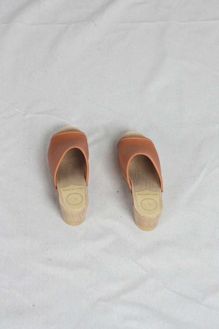 Minimal, 90s-inspired clog sandal in a warm shade of caramel. Matching leather binding at openings. Open back. Mid heel base adds extra comfort and walkability.