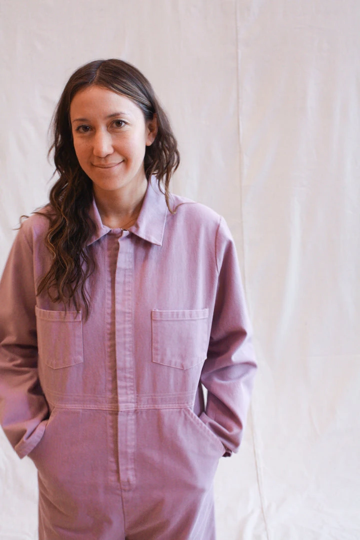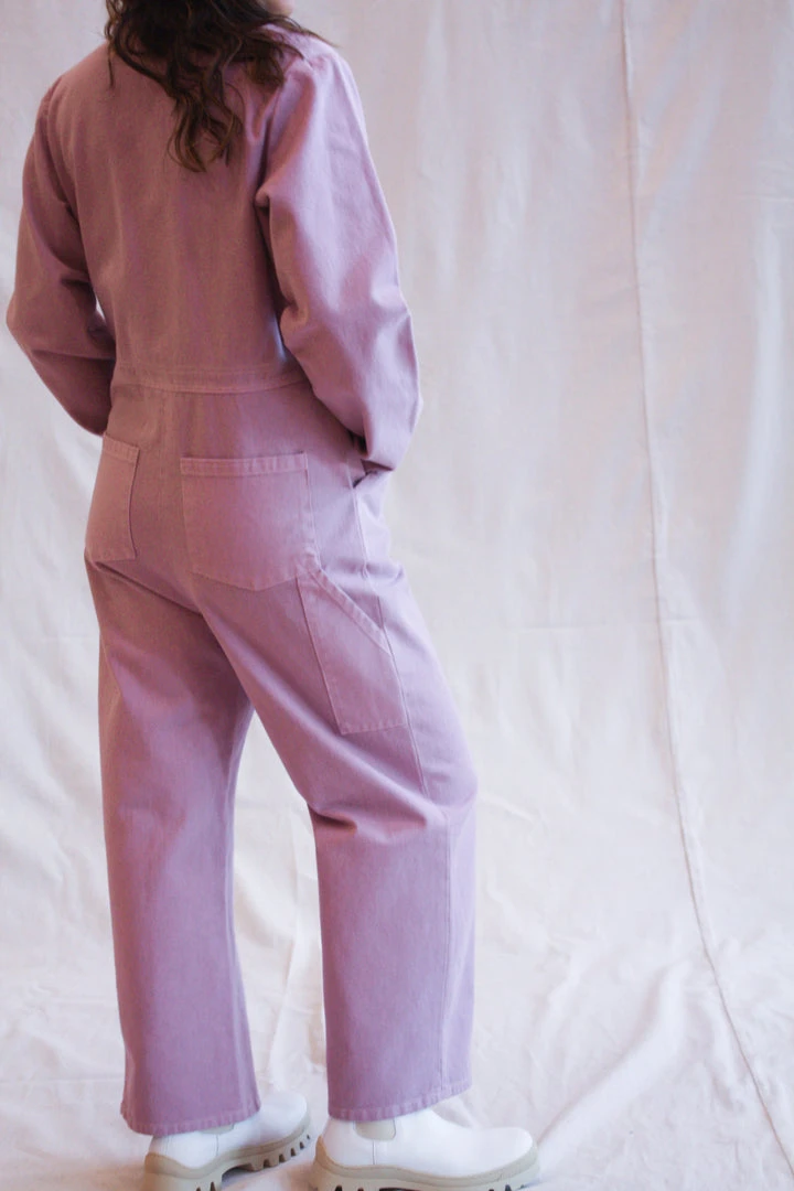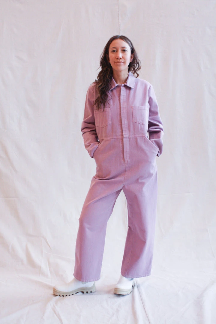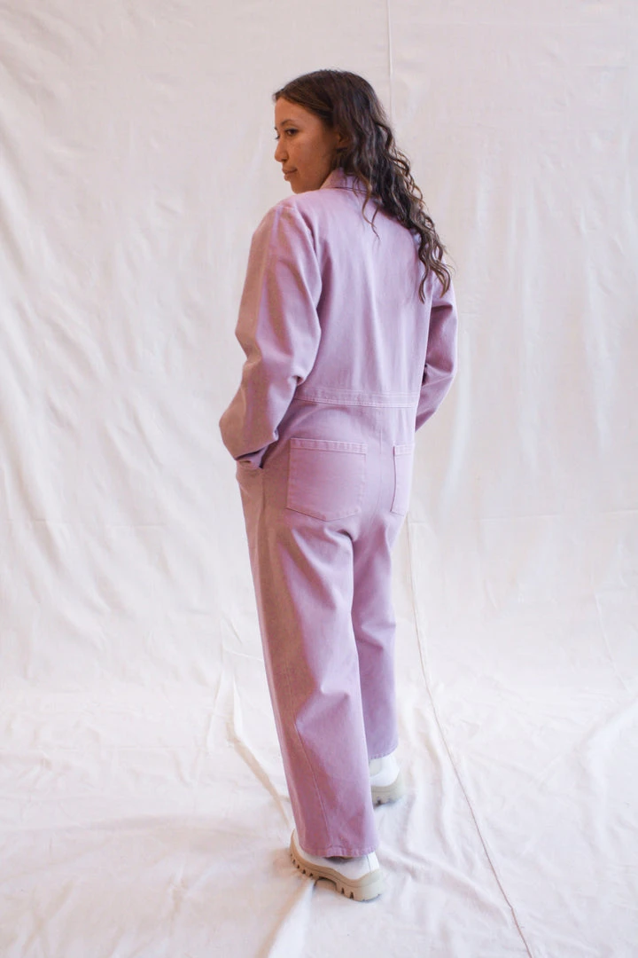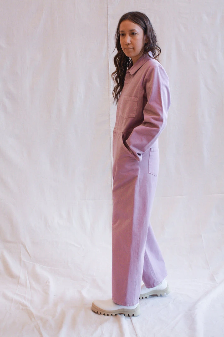 A modern, workwear-inspired coverall. Made from lilac mid-weight cotton twill. Two front pockets and two side pockets. Hidden front zipper closure.