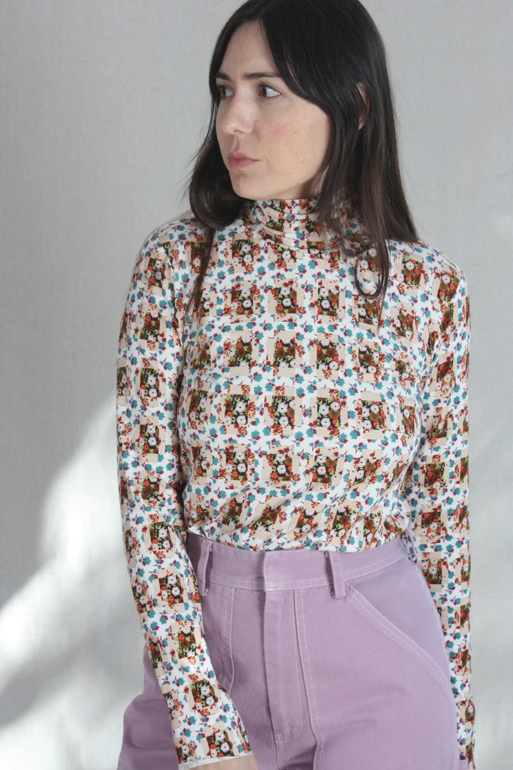 Fitted turtleneck in a soft stretchy floral printed jersey. Intentionally long neck, wear gathered or folded over.