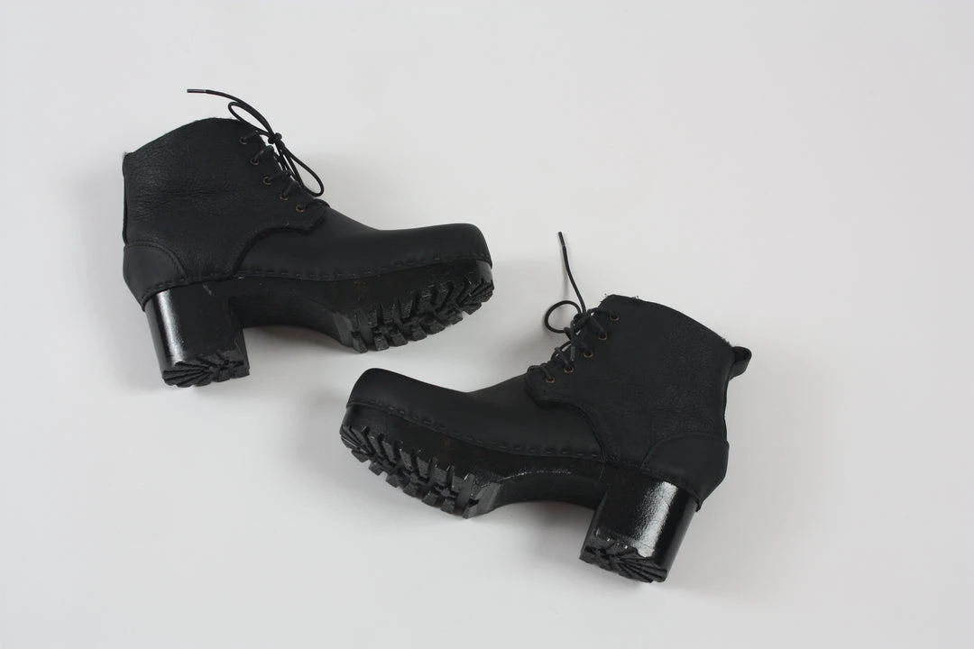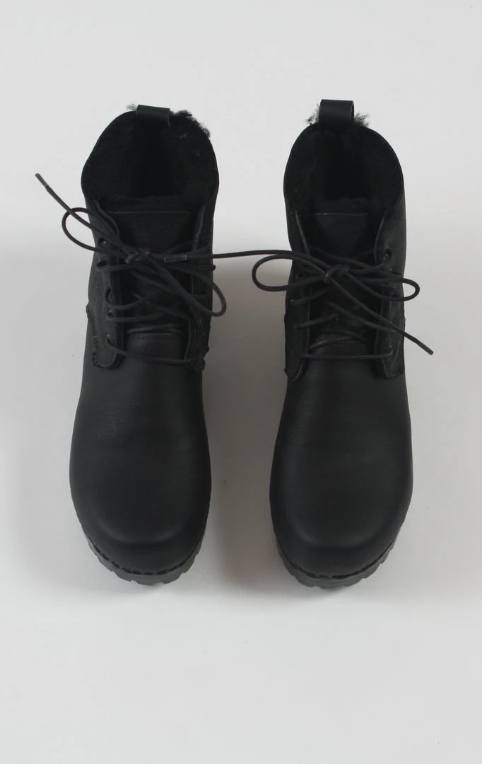 Your leather jacket’s new best friend. Shearling boot on low, chunky heel to keep you warm and comfortable all winter long. 5” tall shaft. Black base and lug sole adds extra traction and style. Black leather toe, heel cap and back tab. Waxed cotton laces. Double Black Aviator shearling is coated with a crackled, leather-esque finish.