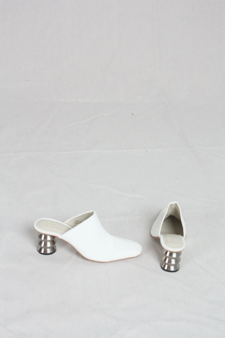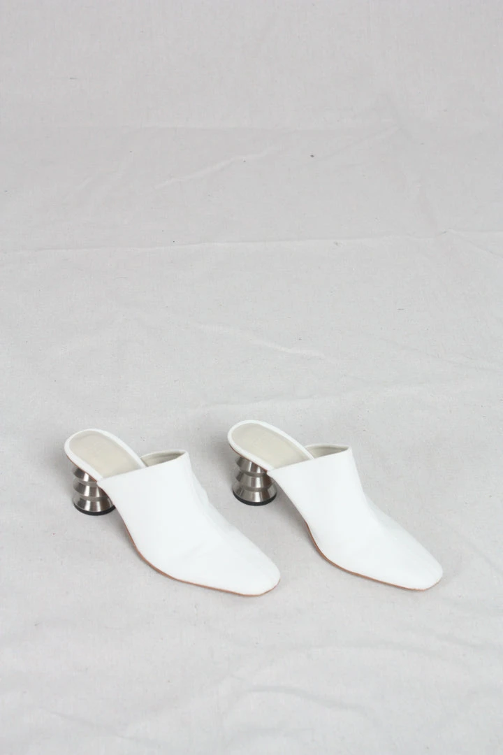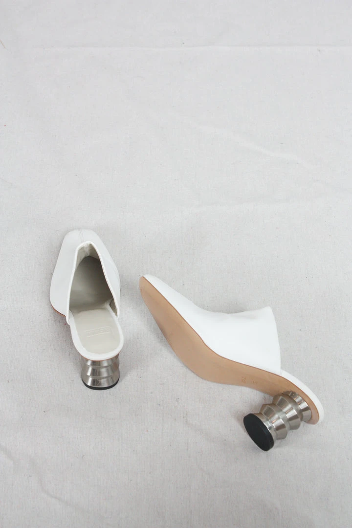 High Vamp mule with signature Nomia sculpted Zig Zag heel in brushed Silver finish. Soft Faux Nappa upper with center seam detail.