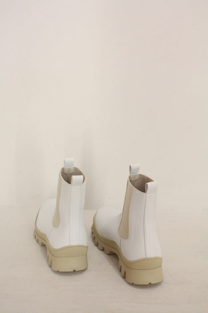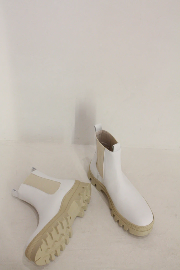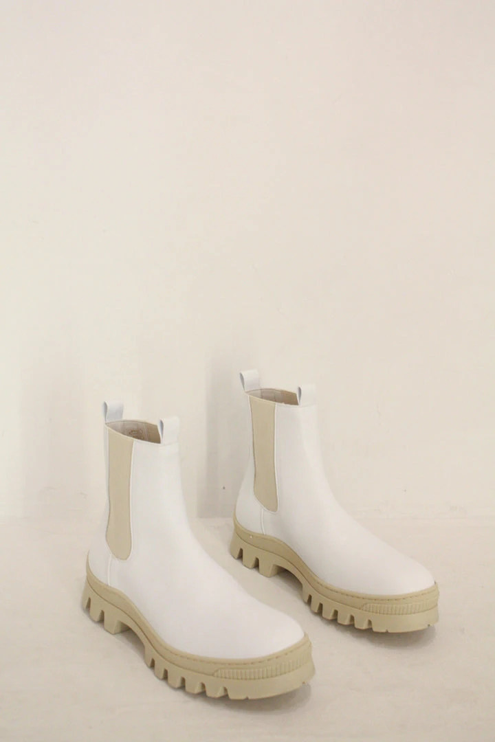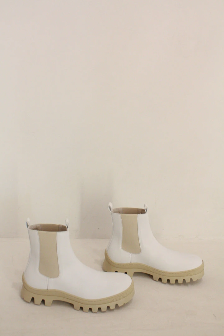 Chunky pull-on Chelsea boot in White heavy-duty microfiber faux calf. Waterproof. Biodegradable high density rubber sole in Beige.Â