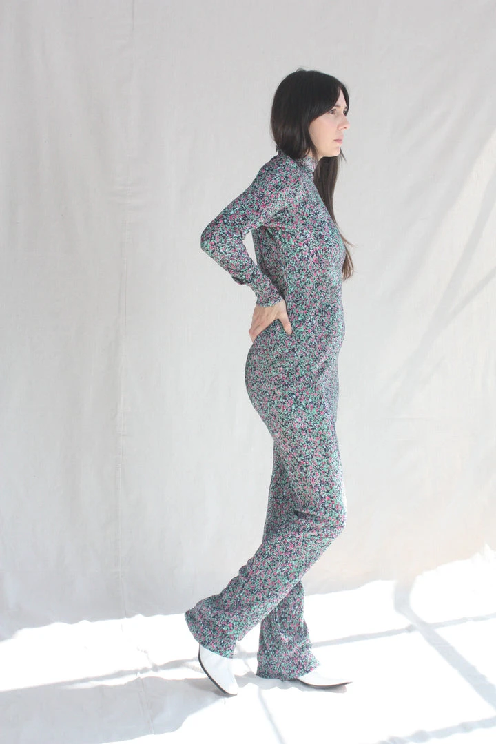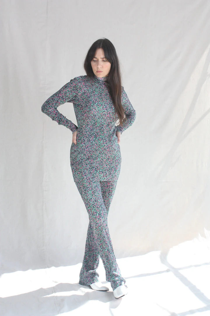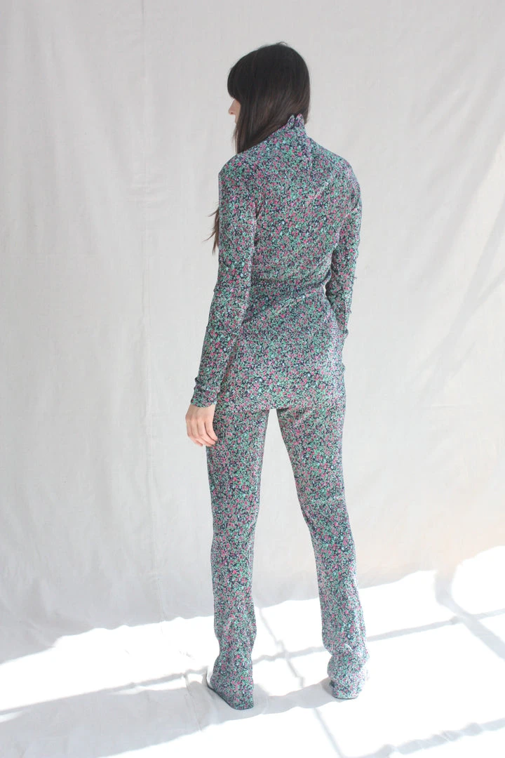 Long pants with raw hem (can be cut to length) and knit elastic waistband in Black floral print.