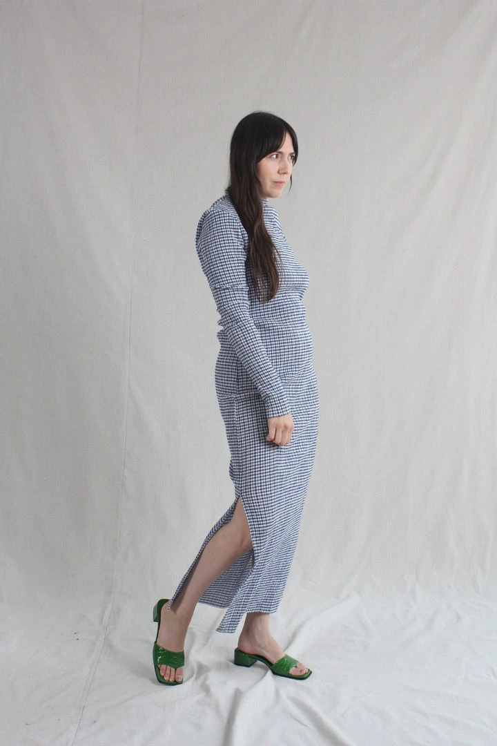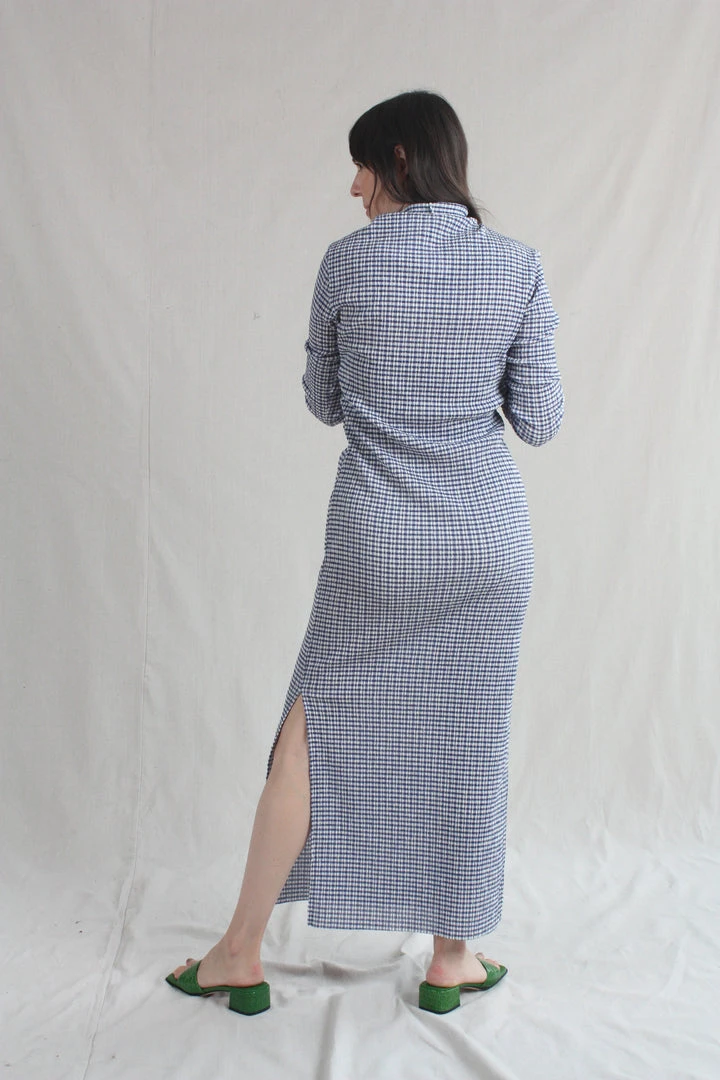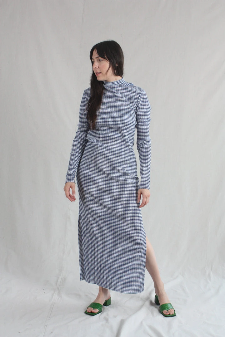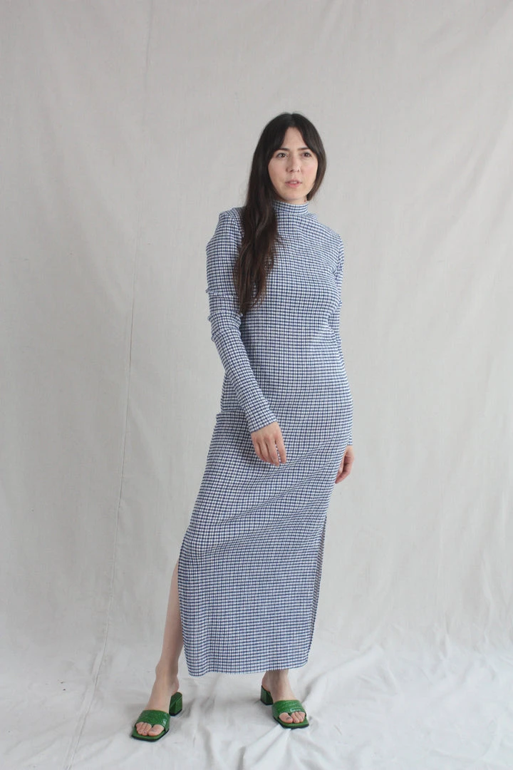 Longsleeve stretchy, textured knit gingham dress with a mock neck. Perfect for layering over knit pants or wearing it’s own.Â