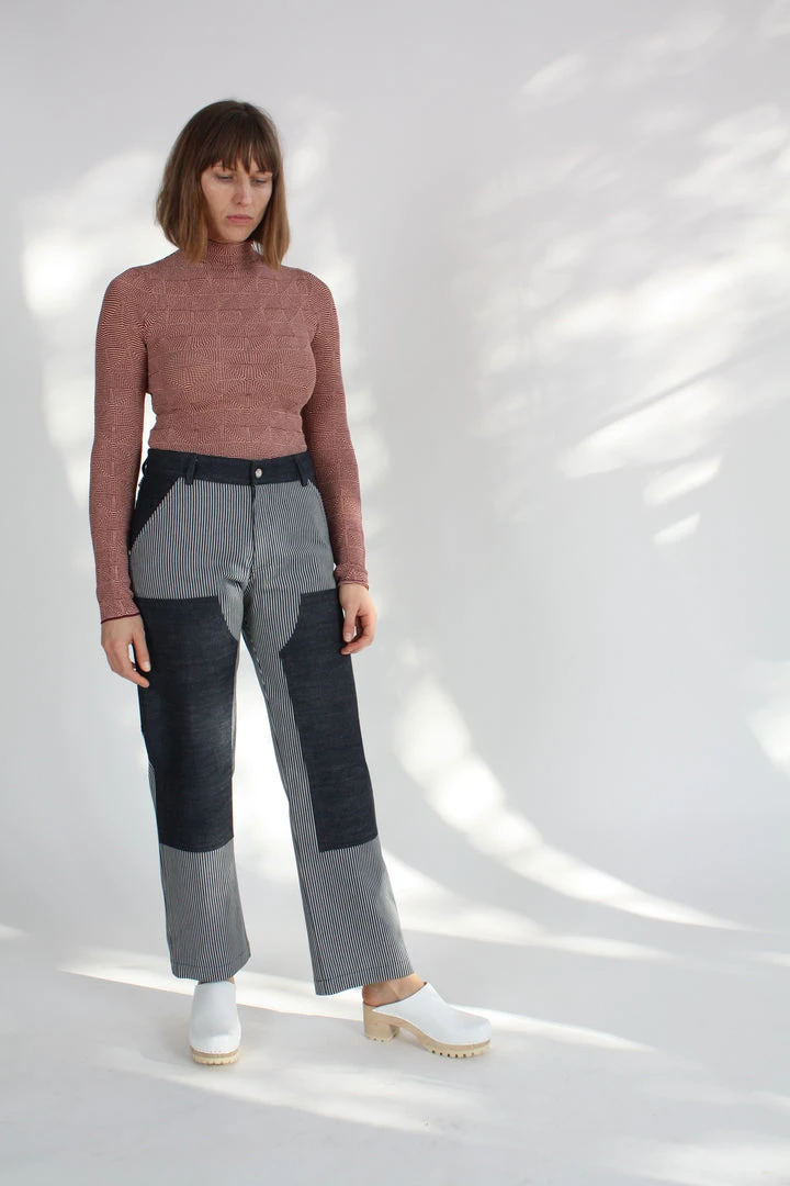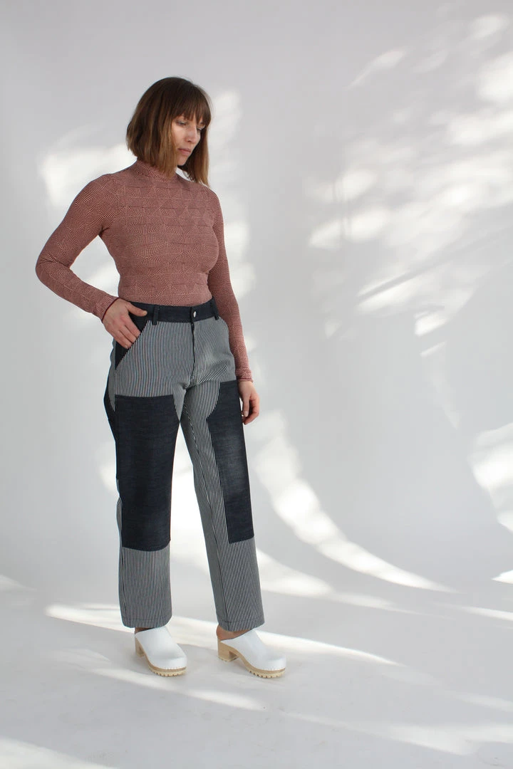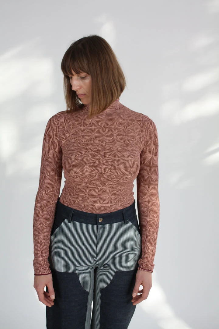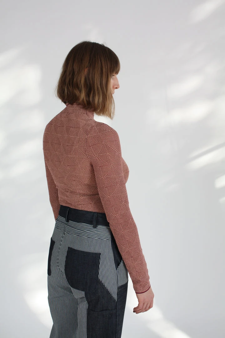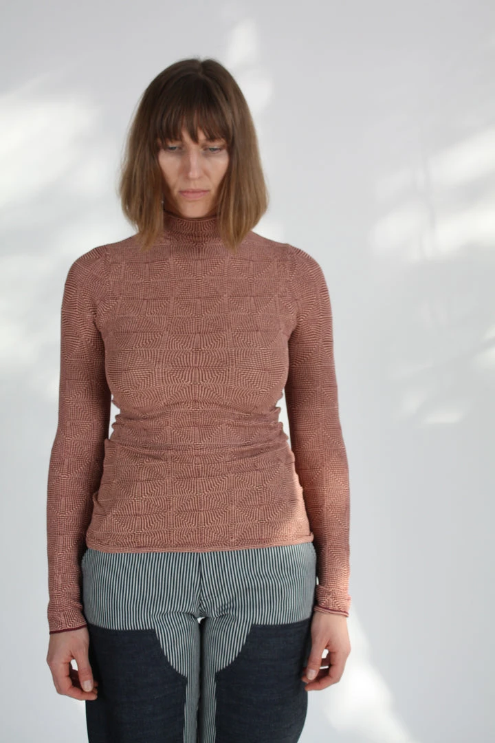 Long sleeve slim-fitting mockneck sweater in burgundy and tangerine “optical” knit.Â