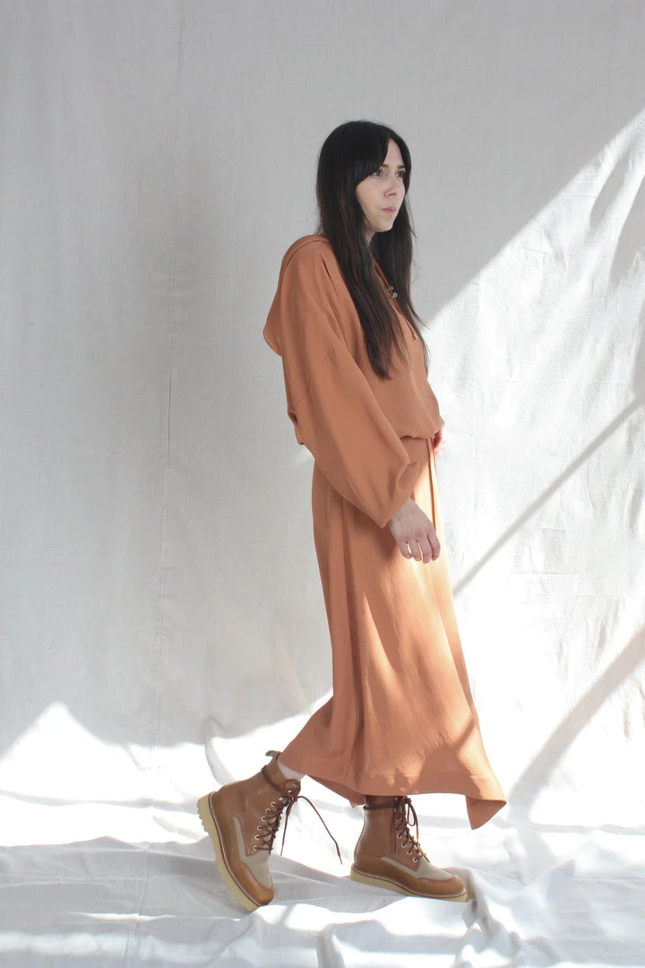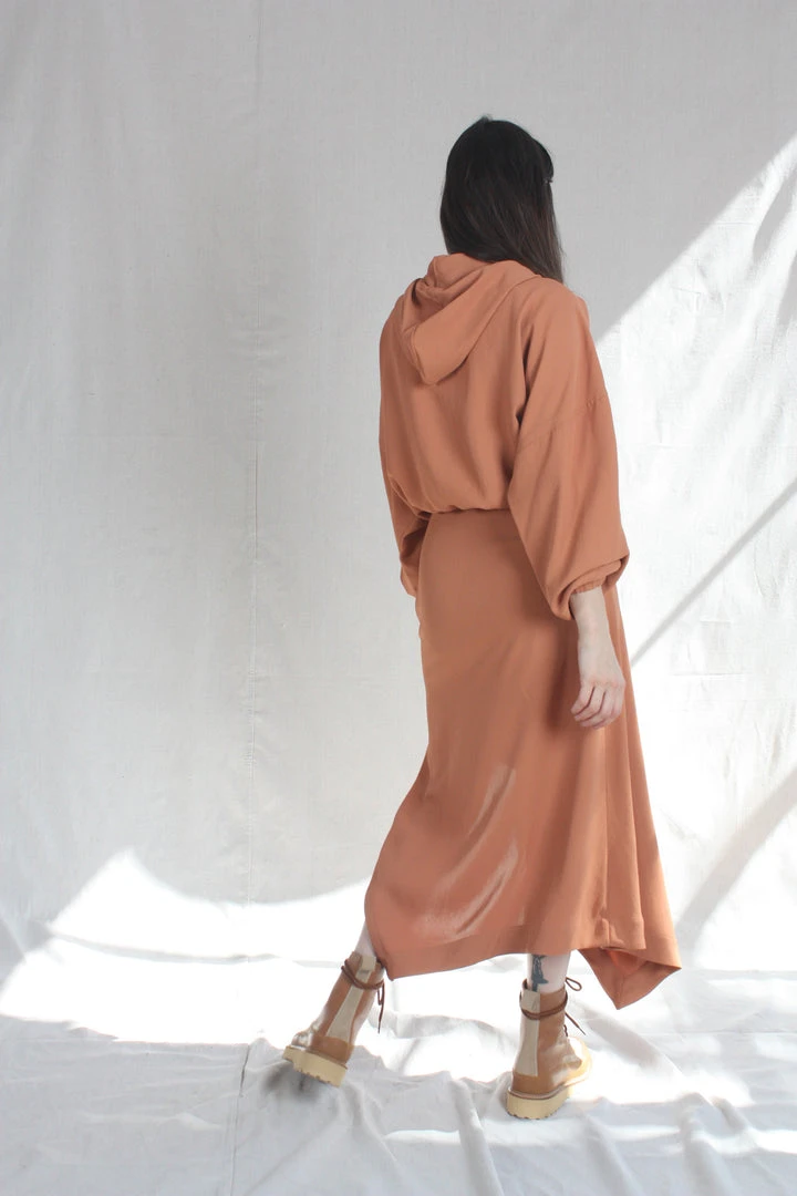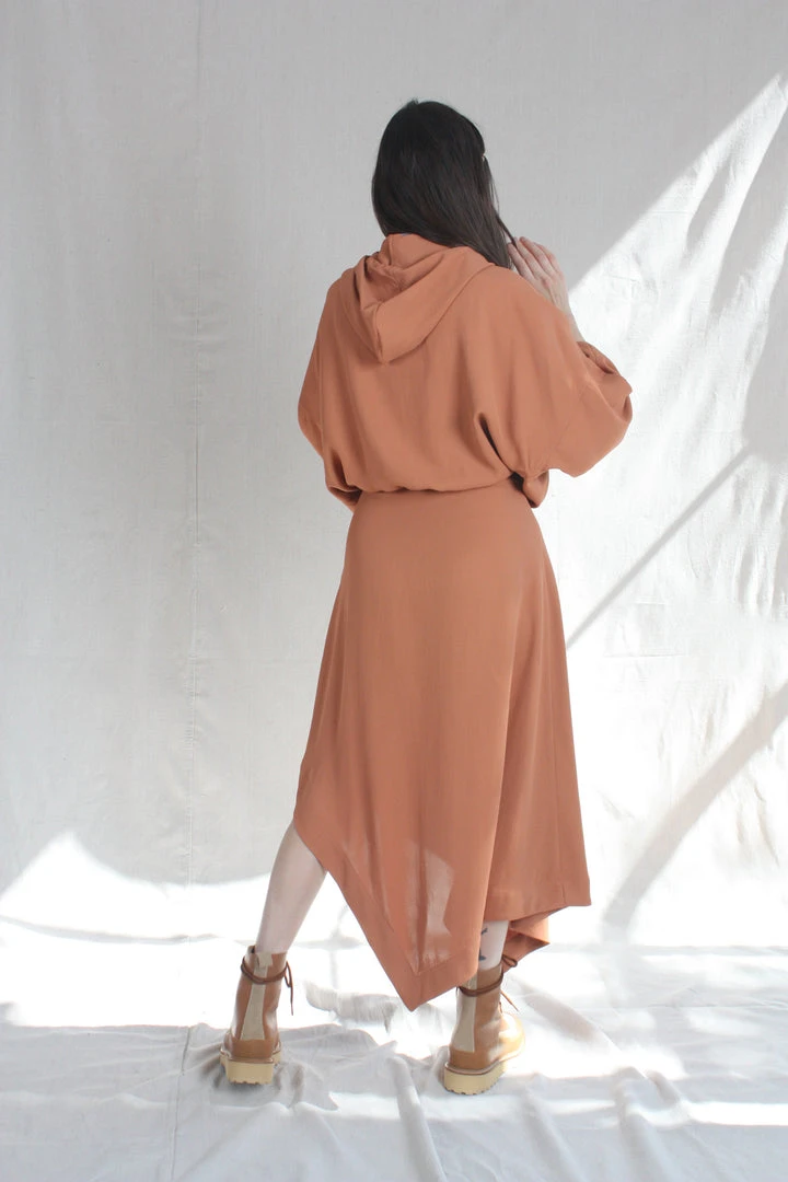 Flared, handkerchief hem skirt in fluid draped acetate. Invisible zipper at side hem with center pleat at front.