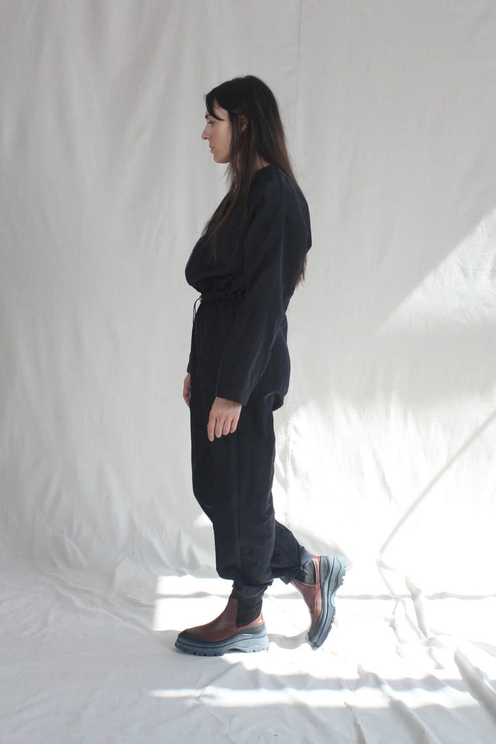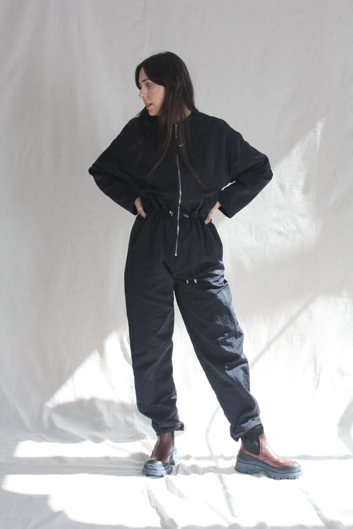 Long Sleeved jumpsuit in techy washed polyester with front zipper, bungee drawcord at waist with silvertone toggles. Two side seam pockets and hidden snaps at ankle hem to taper, if desired.Â