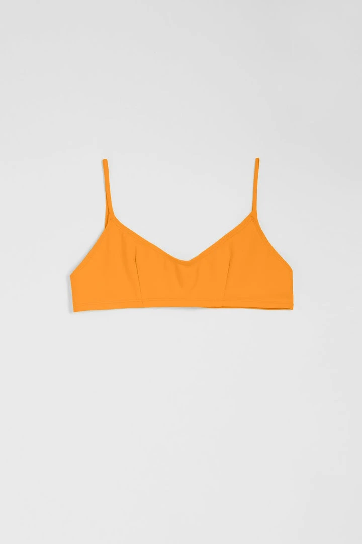Simple soft top with darts for fit and 1/2″ encased elastic hem for extra support.  Medium coverage. Fully lined.