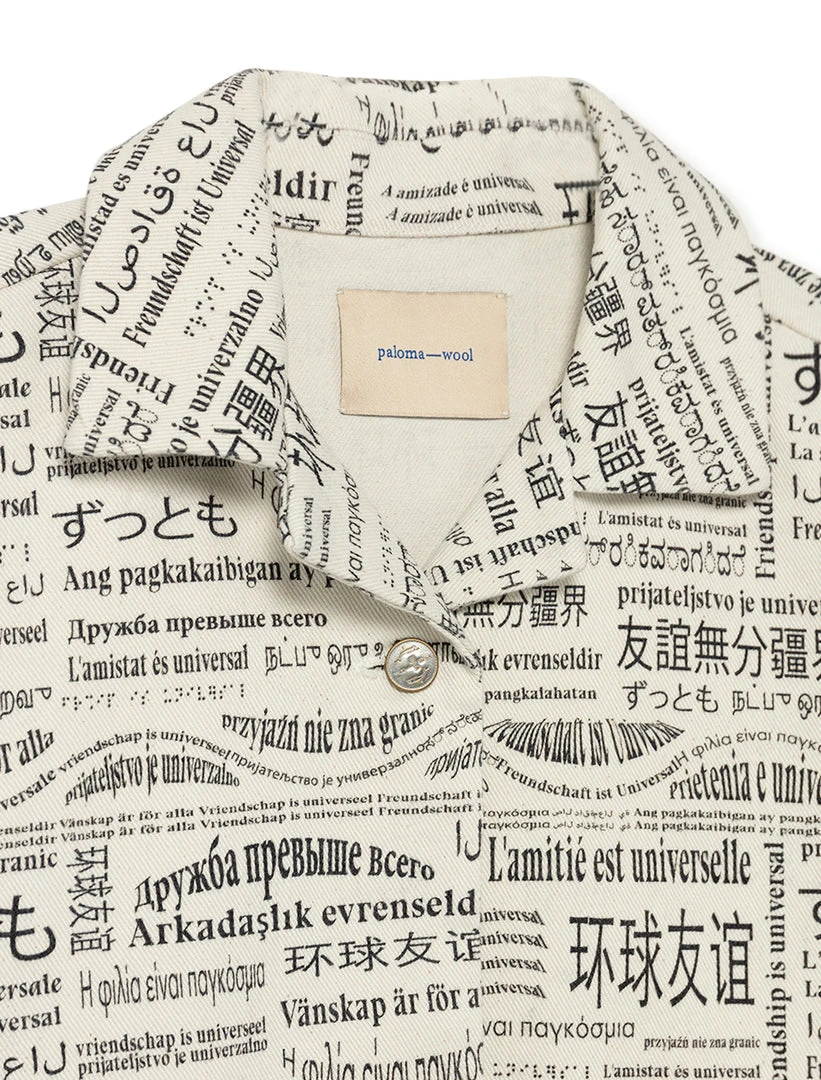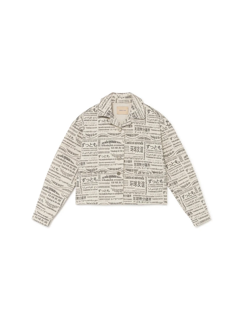 Square fit jacket with front pockets in universal Friendship print. Button front.