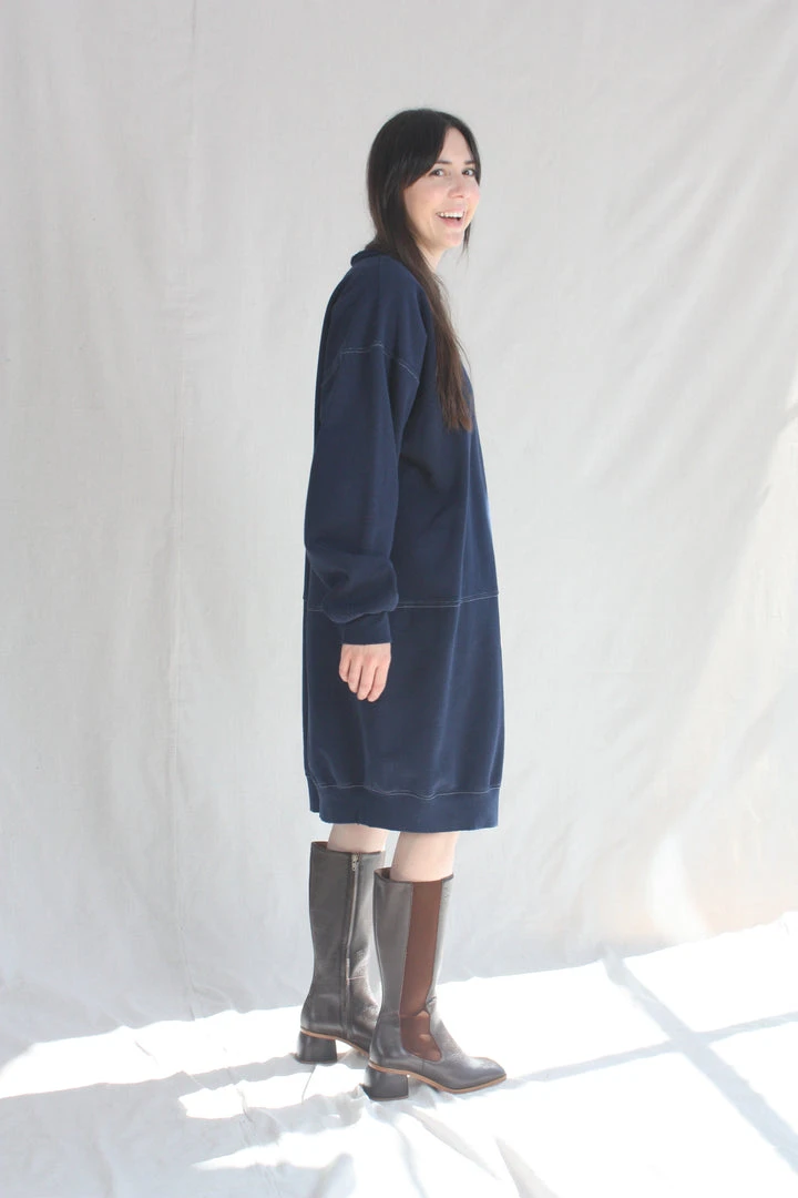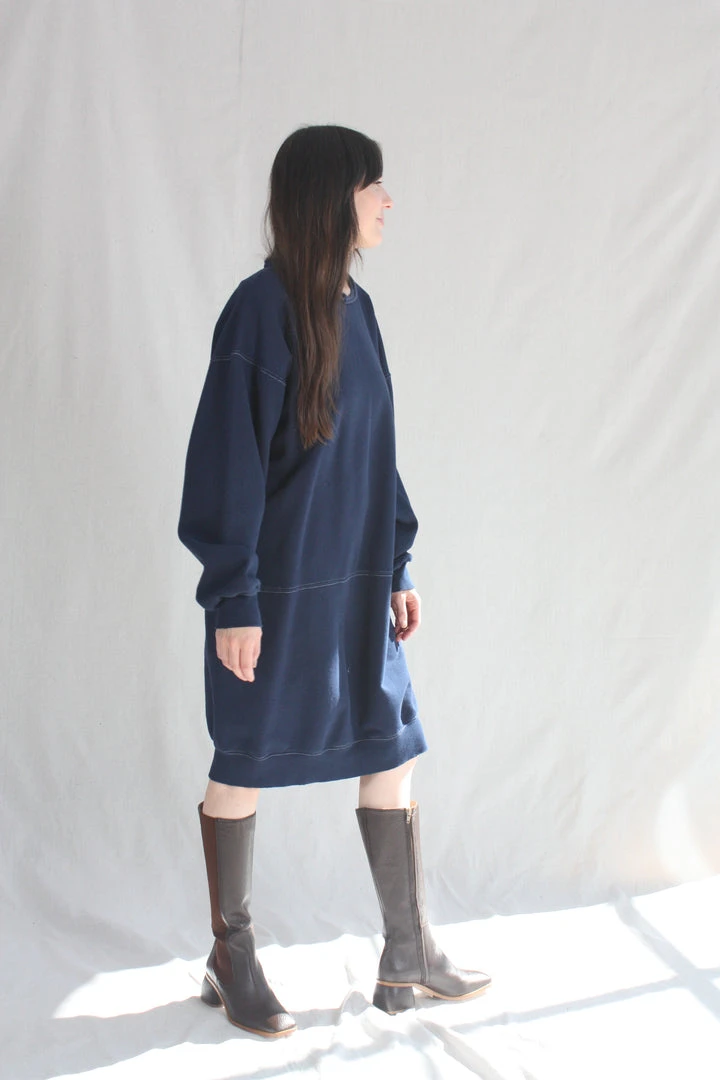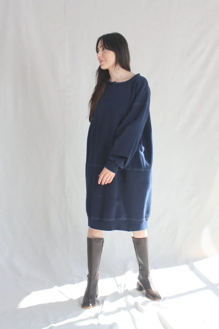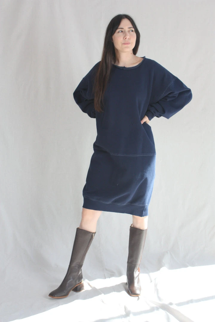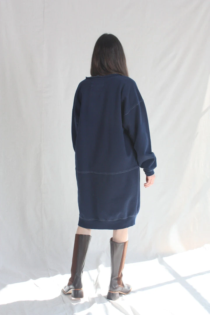 A knee-length dress version of a favorite, vintage-inspired RC sweatshirt, with wide raw-edge neckline, drop shoulders, voluminous sleeves, and unique distressing throughout.