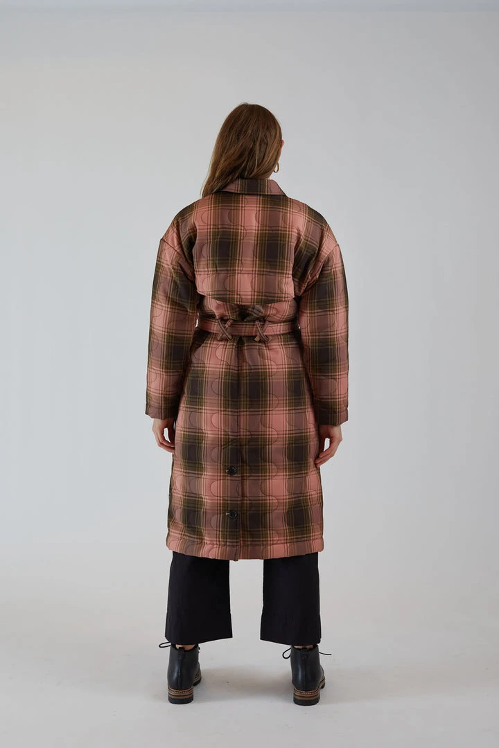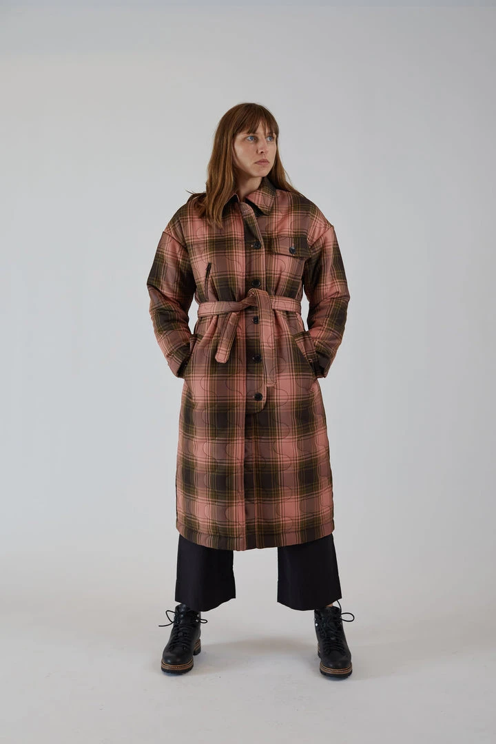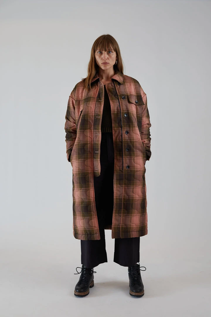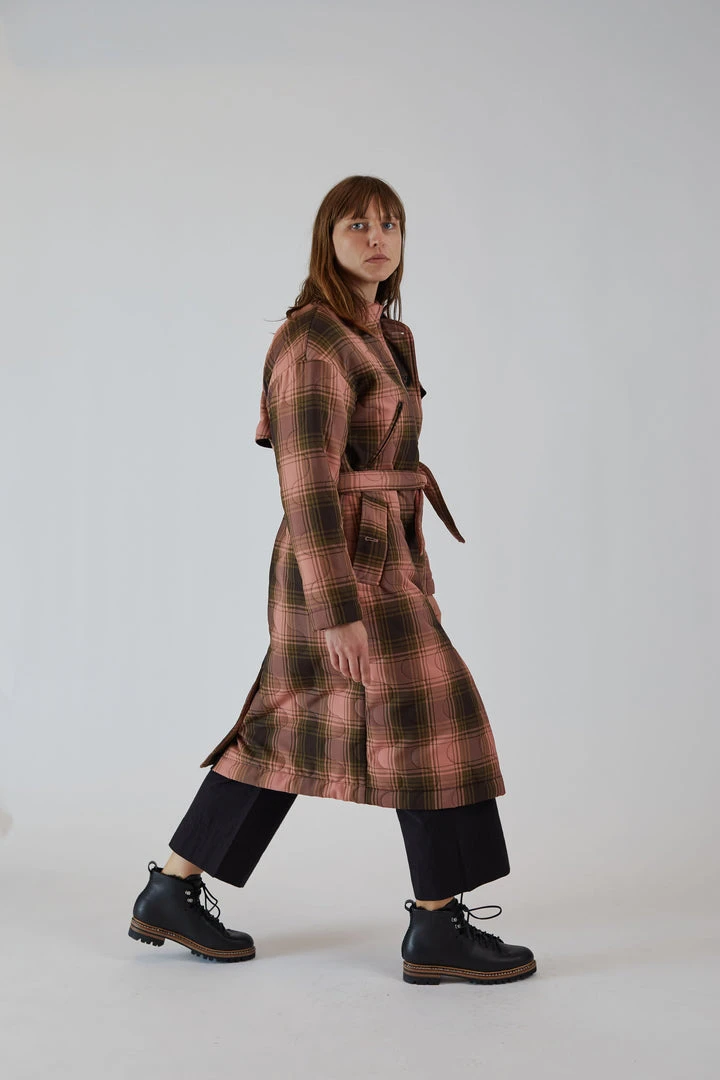 Long,  straight cut quilted winter coat in a Bottiglia Check fabric and Squiggle Quilt motif. The Squiggle Quilt stitch is Rachel Comey’s take on the classic onion quilt. Bottiglia Check is a collaboration between one of Rachel Comey’s Italian mills and a leading Asian upcycling group.  The fabric is woven from upcycled water bottles and has a smooth, dry finish. Welt pockets at the waist. Interior and exterior breast pocket. Waist tie, button placket, and interior zipper placket. Fully lined. Vented back body hem with button closure. Inset storm flap.