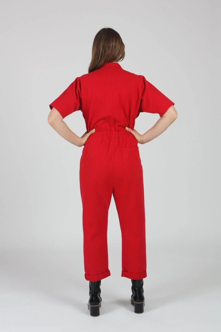 A workwear inspired jumpsuit with color blocking in a bold red and black. It has a slightly boxy cut that can be fitted with a waist tie at the hips. The legs are long and straight with the option to cuff the hem. Easy to jump in and out of with a zipper fly closure along the front. Front zipper closure Belt at the waist. Slash pockets at the hips