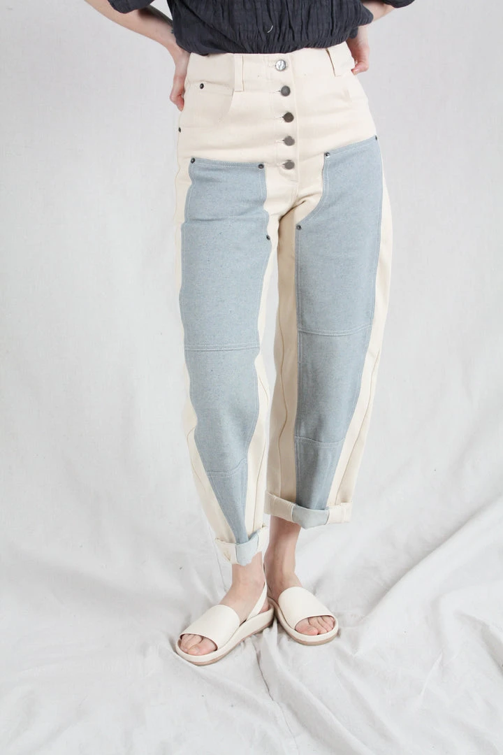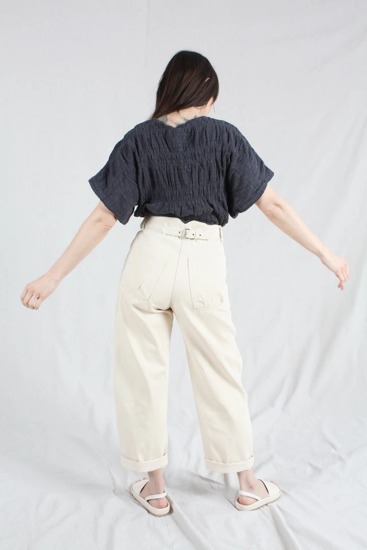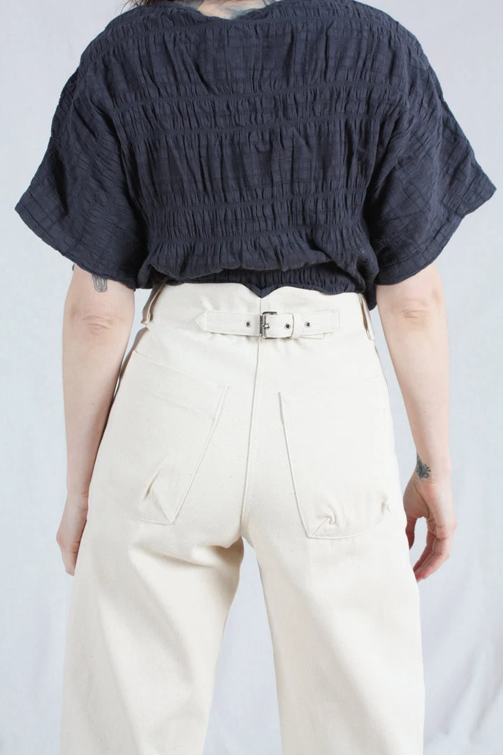 The Handy Pant is a relaxed style that sits at the lower waist, on your hips, or as an option, you can tighten the back strap to sit higher at your natural waist. Panels along the front legs add workwear flair to the silhouette. Crafted from Upcycled Cotton, this style is made from pre- and post-consumer textile waste, ground back into fiber to spin into new yarns to weave fresh upcycled fabrics. These fibers are all natural, compostable and free of chemicals and dyes leaving an overall positive carbon footprint. Button fly closure. Five pocket styling. Straight leg.
