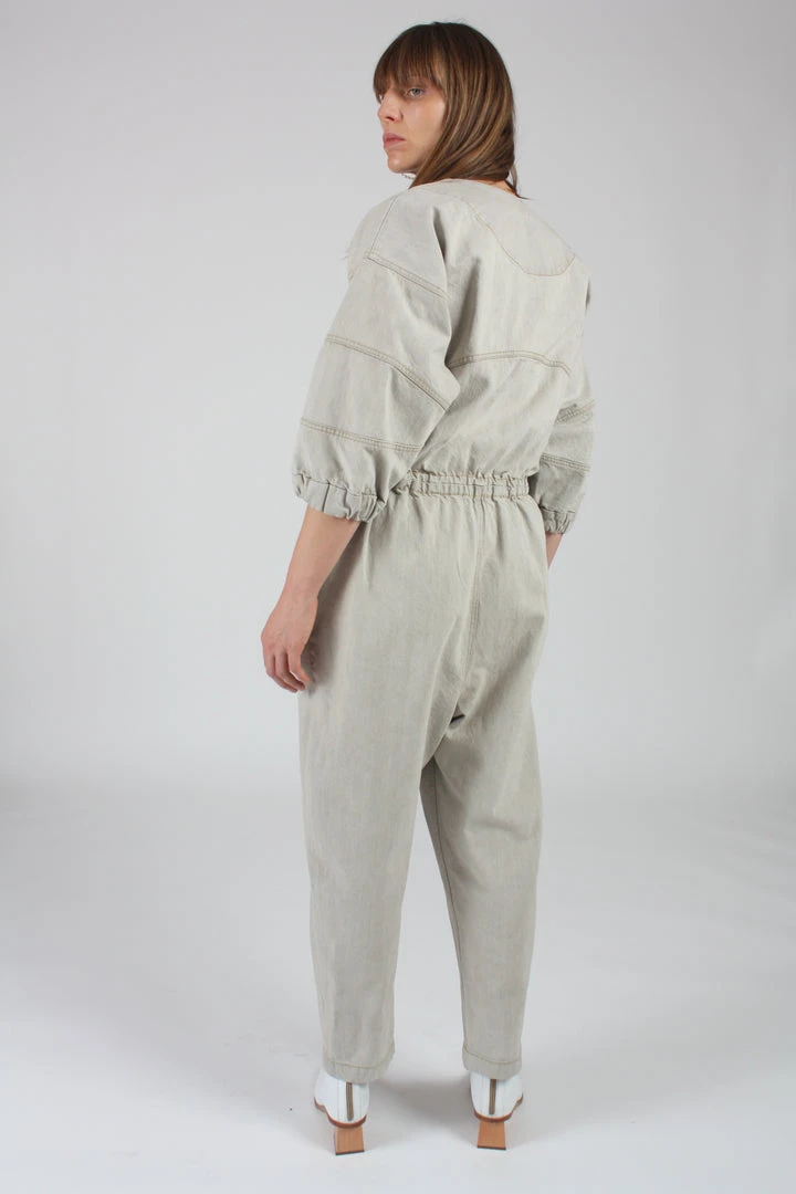 The Holt Jumpsuit is an all-in-one style with an easy fit that makes a flattering, retro shape on the body. The split neck can fly open or snap closed, the elasticized sleeves can be pushed up or down, the waist will sit wherever is comfortable. Layer under it during winter or wear it solo during warmer seasons. Vent along upper midline with double snap closure. Side slip pockets. Dropped rise.