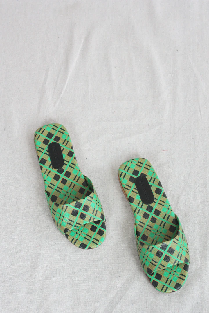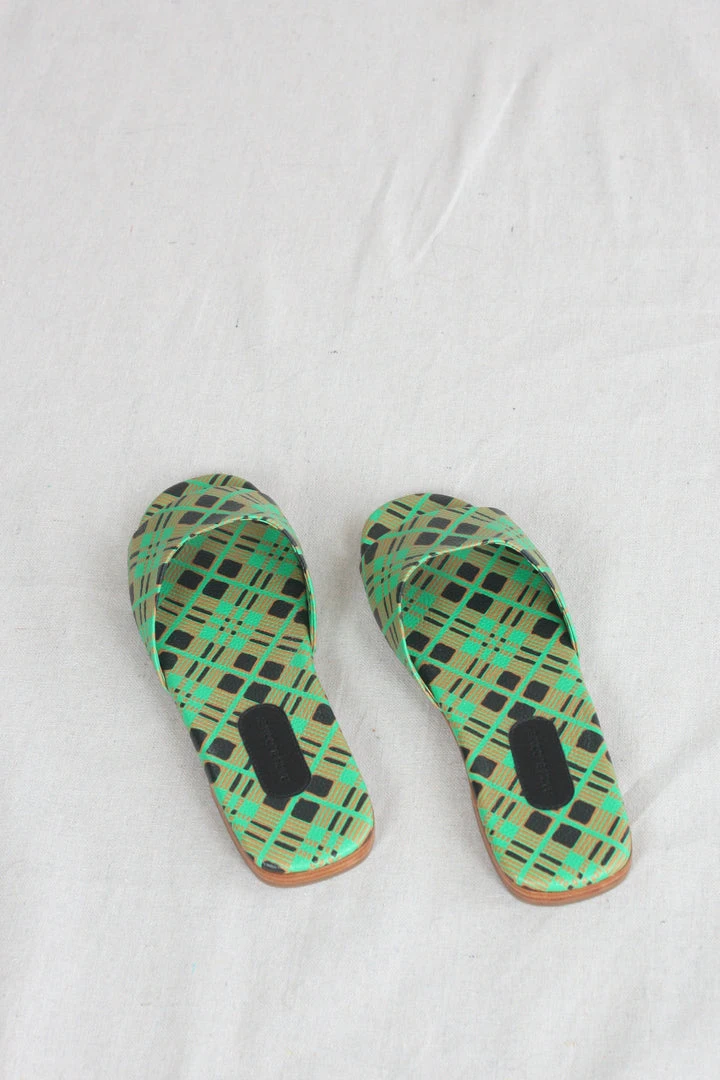 Flat slide sandals in Picnic Check printed leather.