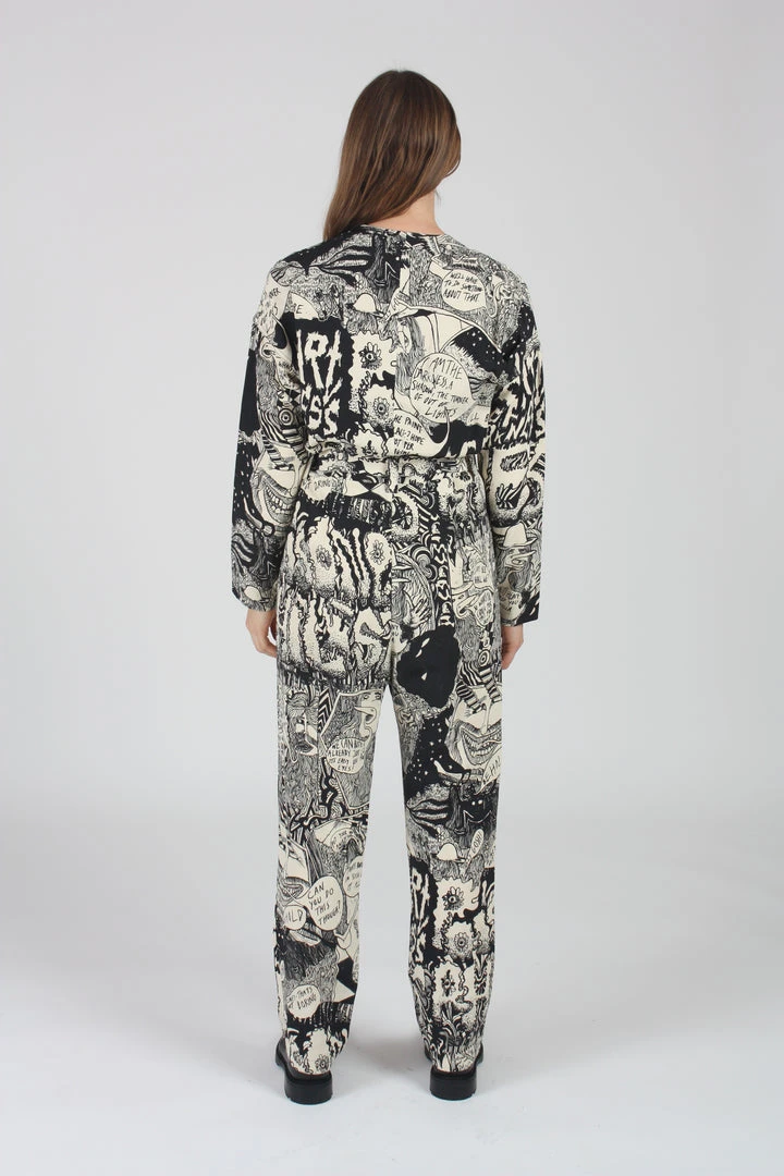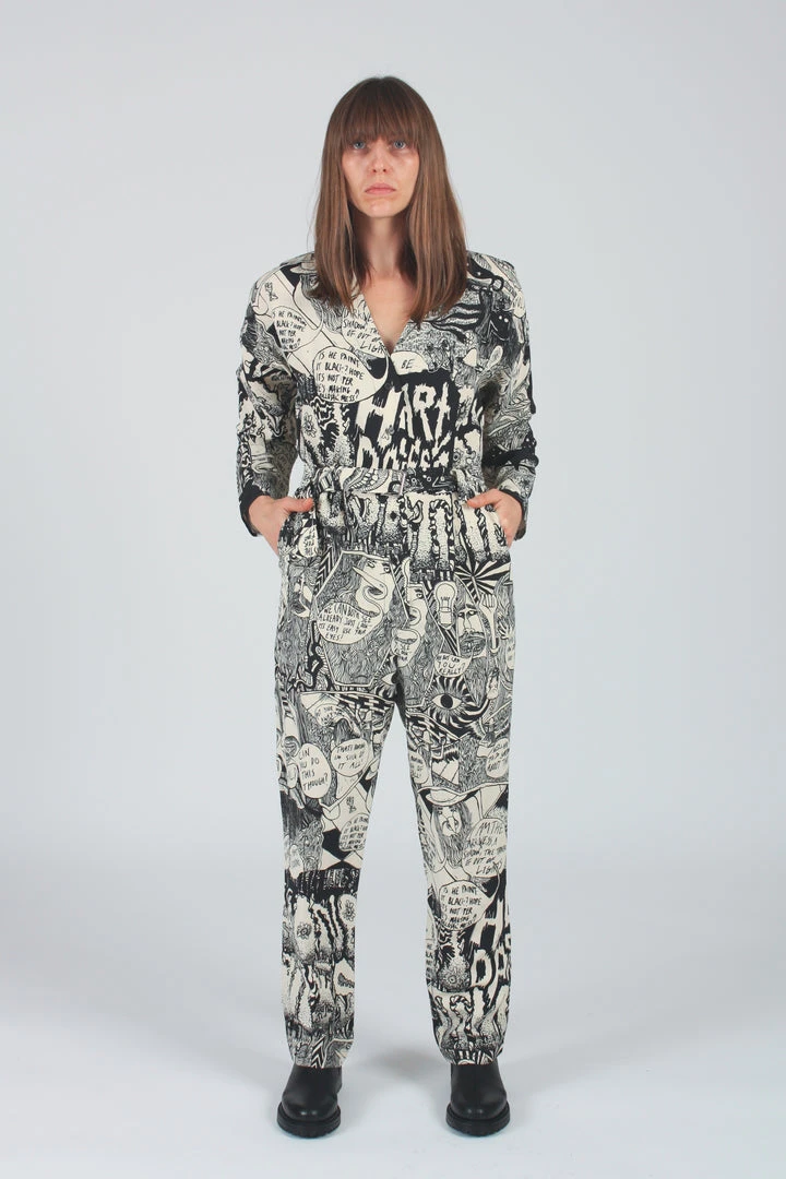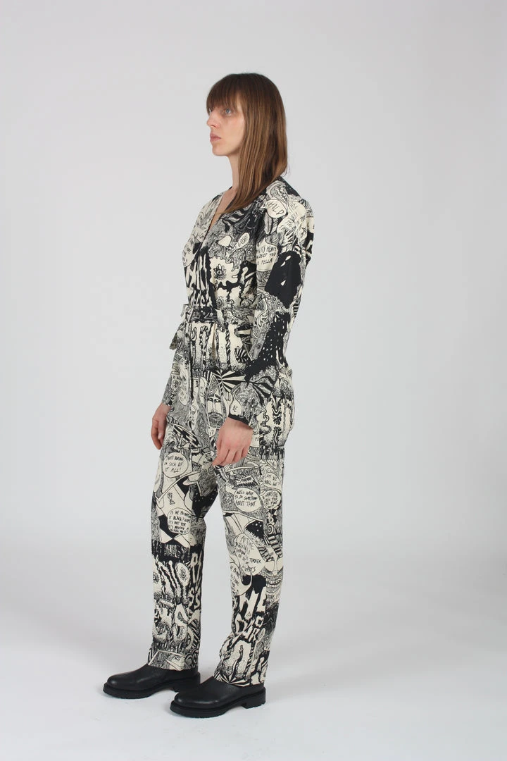 The Glitch is a staple in Rachel Comey’s lineup of jumpsuits. With an underlying column shape, the Glitch has a slightly roomy fit that can be styled to your liking with its belt. The dropped waist and front button closure make it practical and easy to wear. The Glitch is cut from a crisp viscose-linen printed with a Rachel Comey archival “Chatter” print. Button placket closure. Buckle belt at the waist. Slip pockets at the hips.