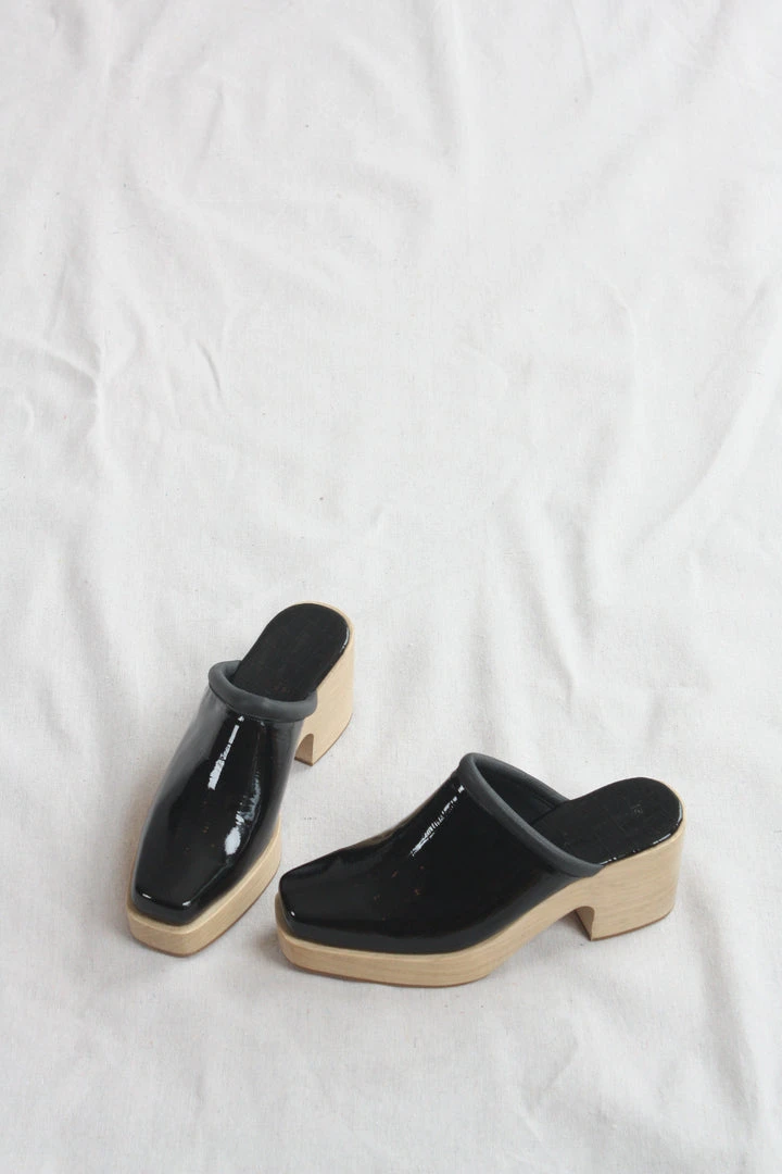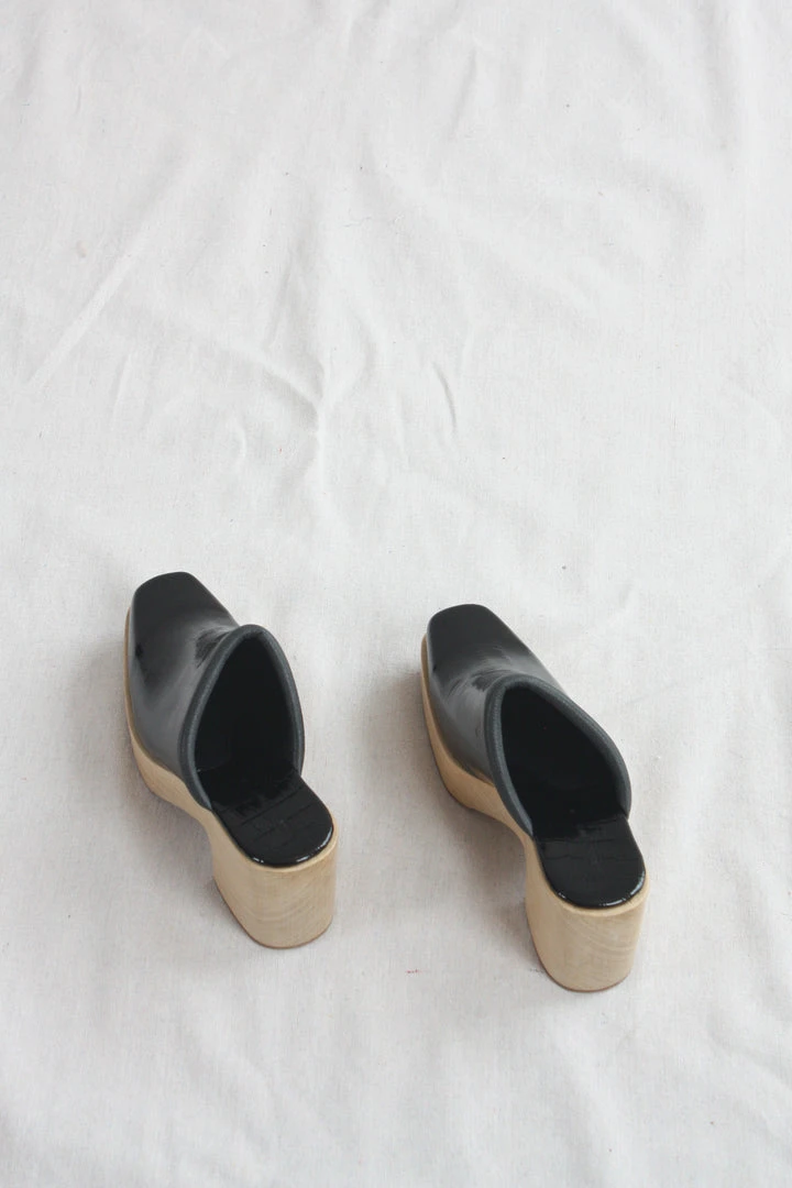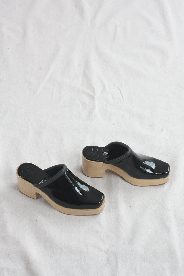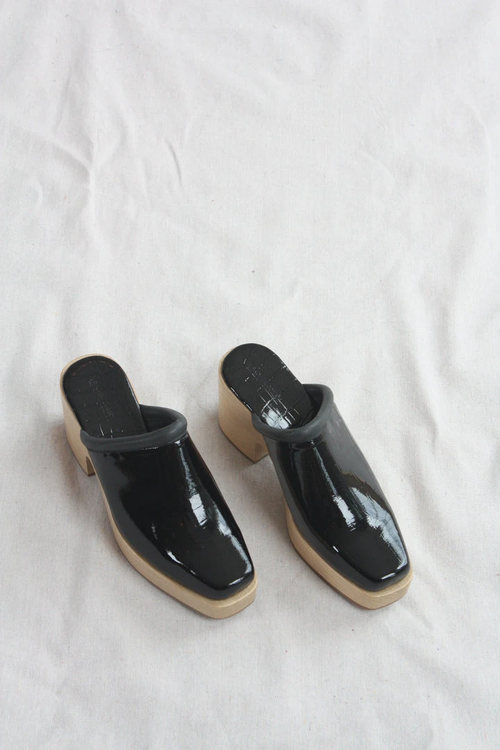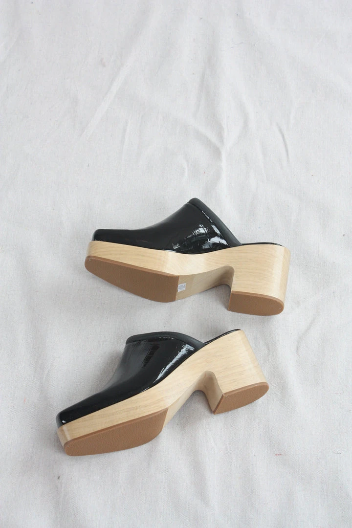 - Upper in 100% Stamped Patent Leather, Sole in 100% Wood