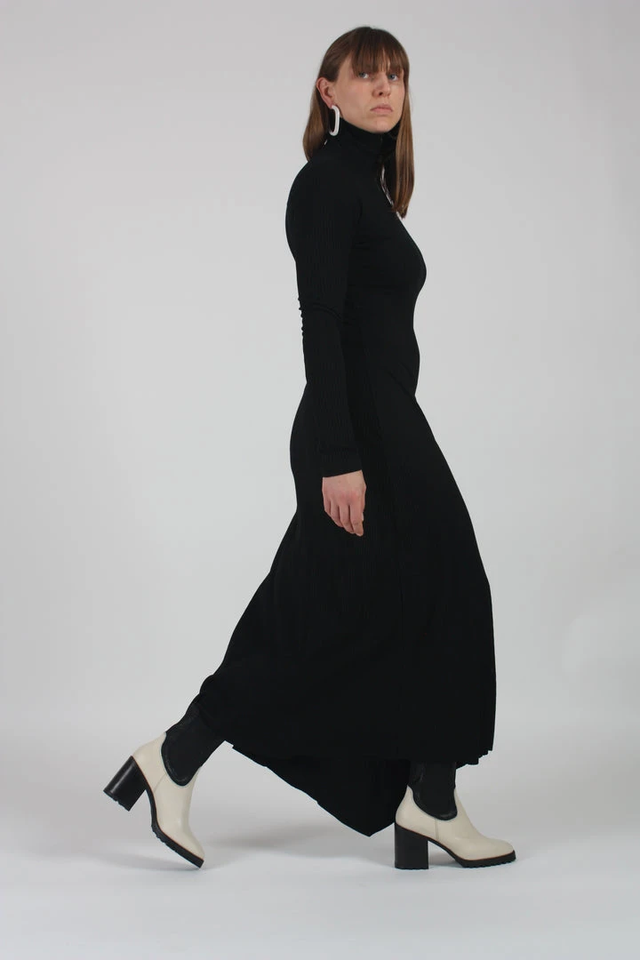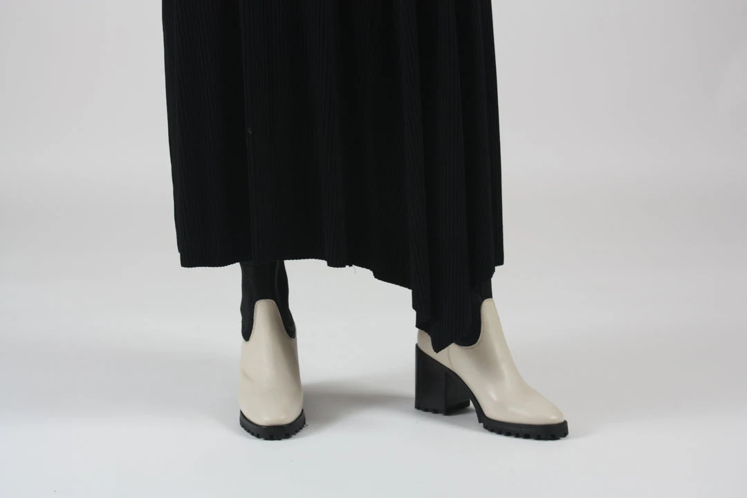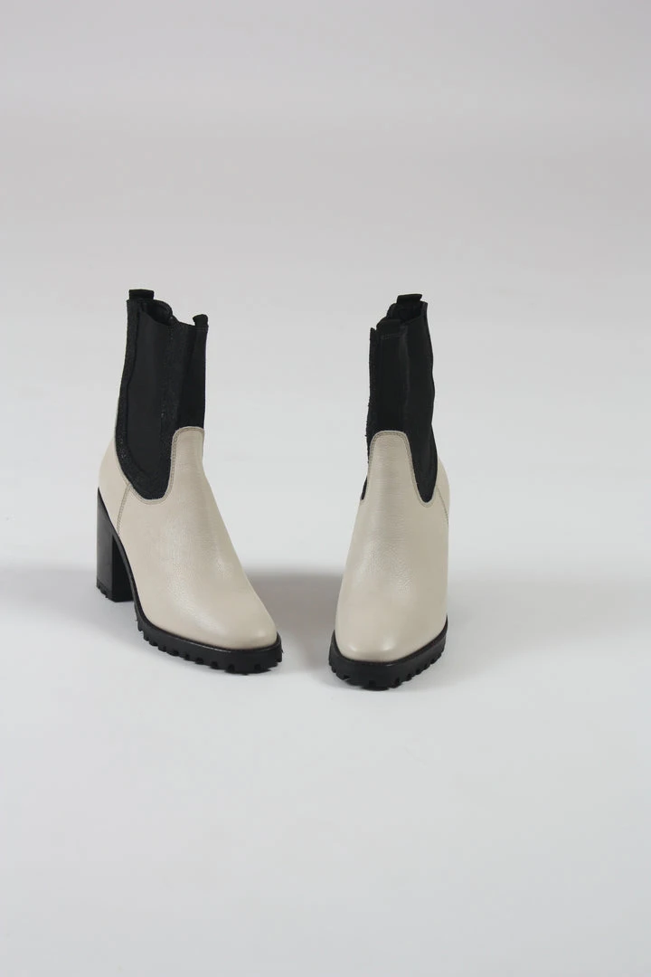 Heeled Chelsea ankle boot. Rounded toe. Pulls on with ankle tab and elasticized gore. Stacked leather heel. Tread sole.