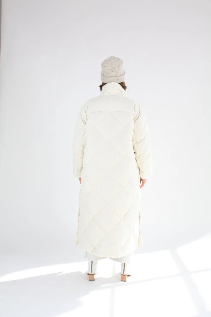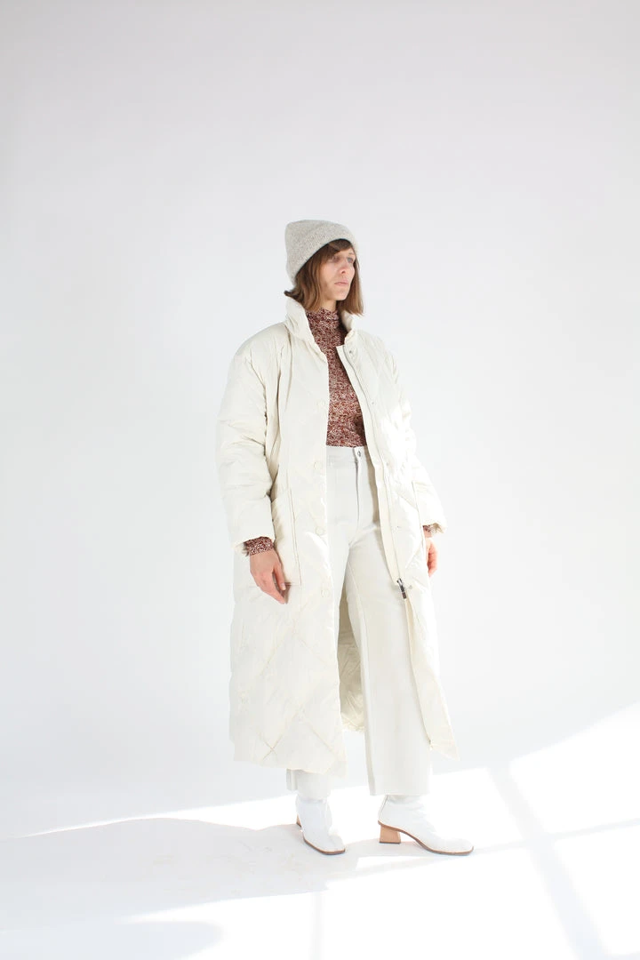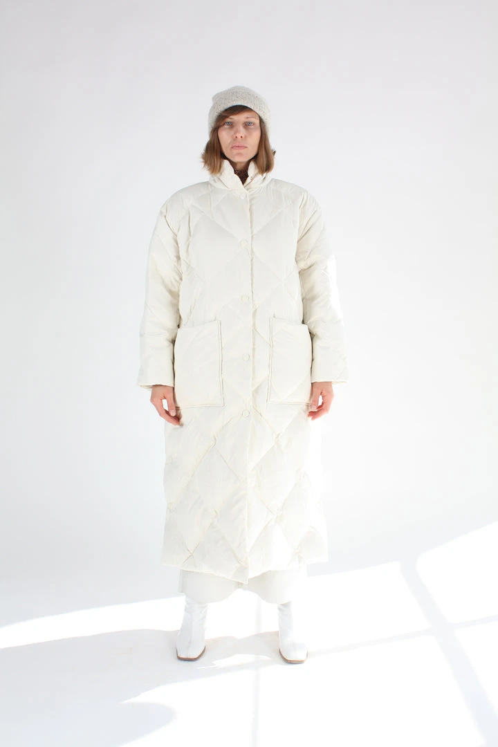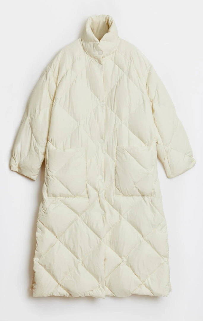 Agapita is a Rodebjer fall essential oversized long jacket made in 100% recycled down. It has dropped shoulders, an overdimensional fit and ends below midcalf. Rubber finished press-buttons covers the silver zip at front. Wear over all your autumn and winter looks. Dry clean only.