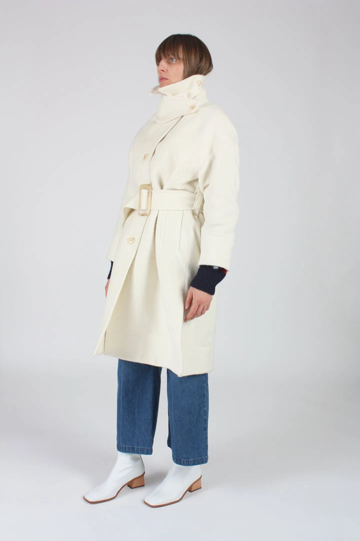 The Boldizsar is a thick, loose fitting coat with large belt and matching marble buckle. It can be belted for a more fitted silhouette and features an extra shield on the collar tp protect the neck when buttoned. Large welt pockets and large lapels.