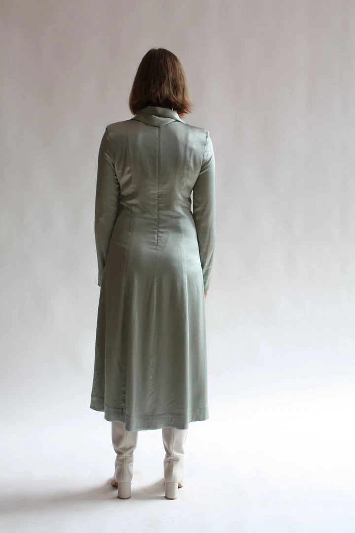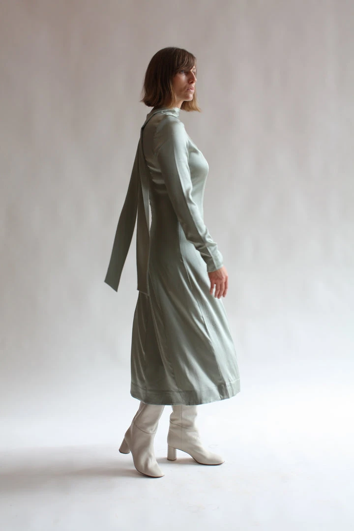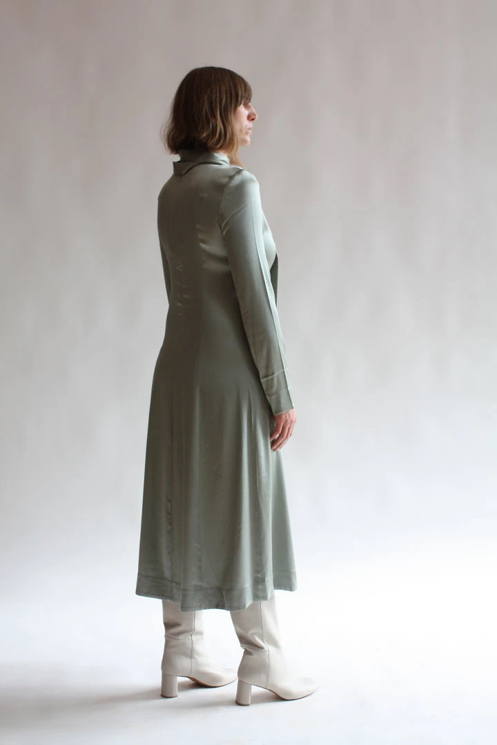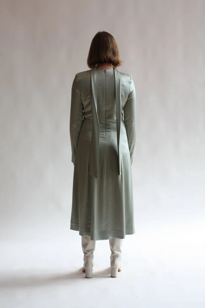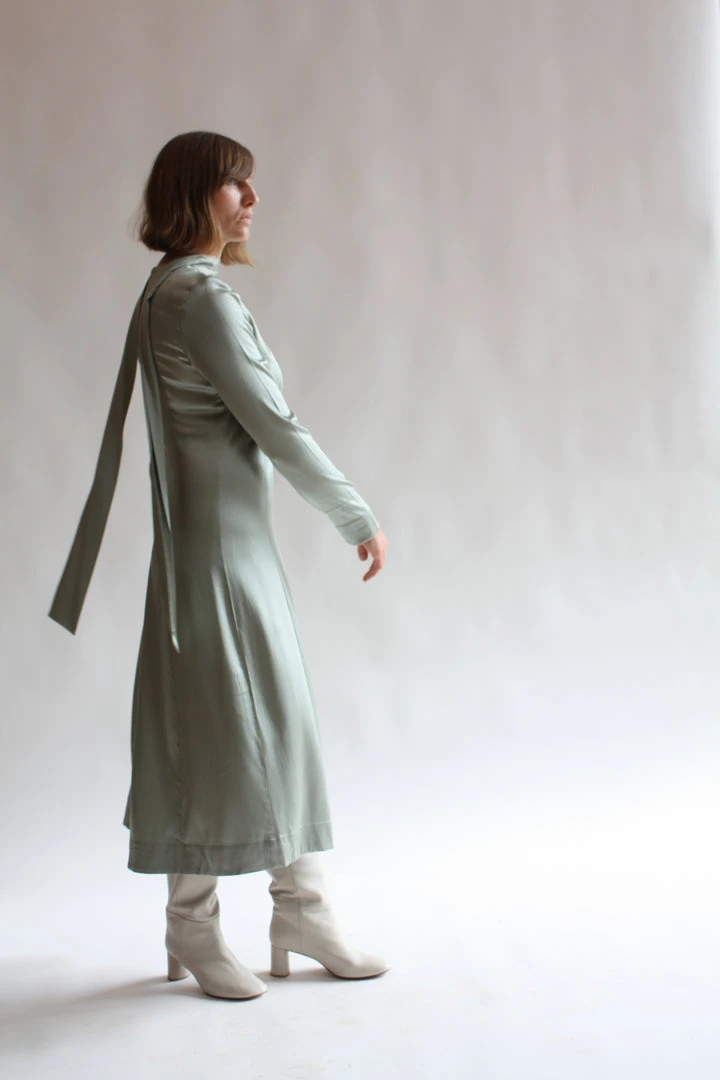 The Acela dress is a midi length dress with long sleeves in a silk bamboo crinkled fabric with a luscious sheen. Loose fit with a flare shaped skirt for a flowy look. Dry clean only.