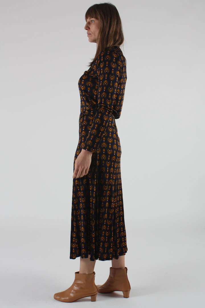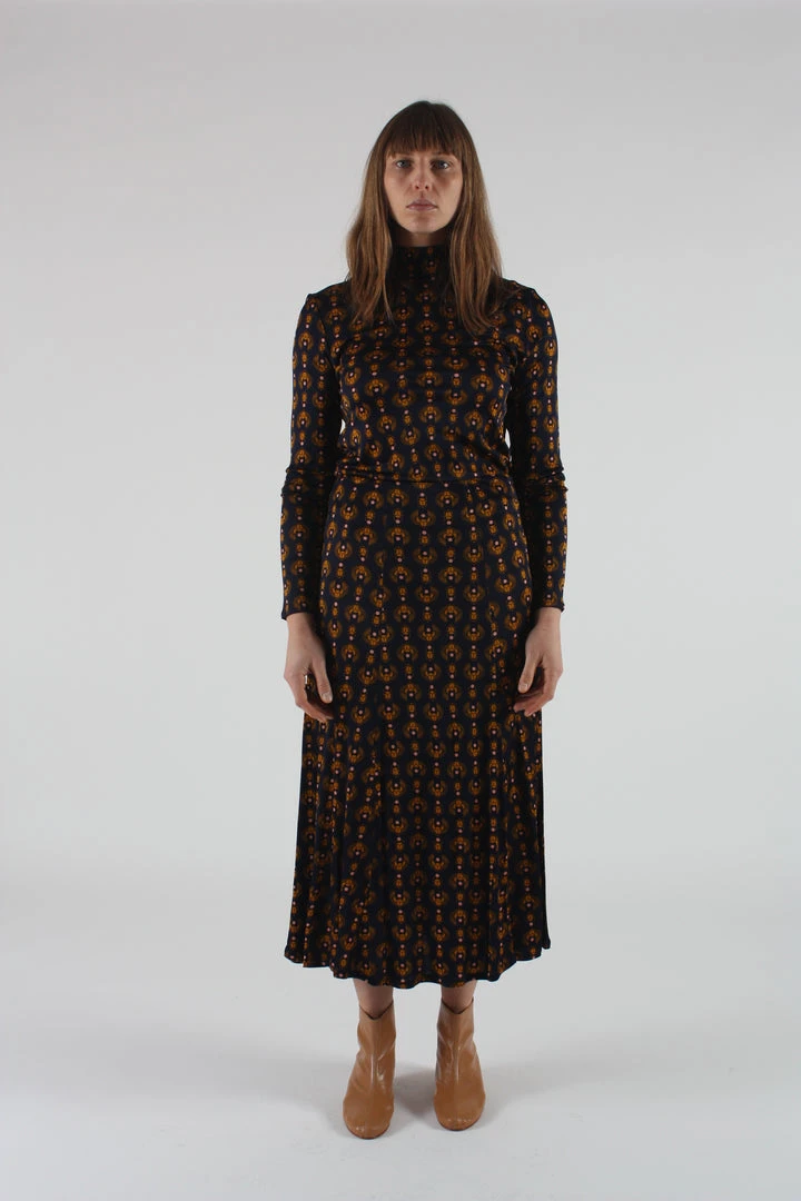 The Inec is a flared skirt in shiny and luxurious viscose jersey. Inec has an original Rodebjer print featuring stylized spirit animal scarab carrying the sun.Â