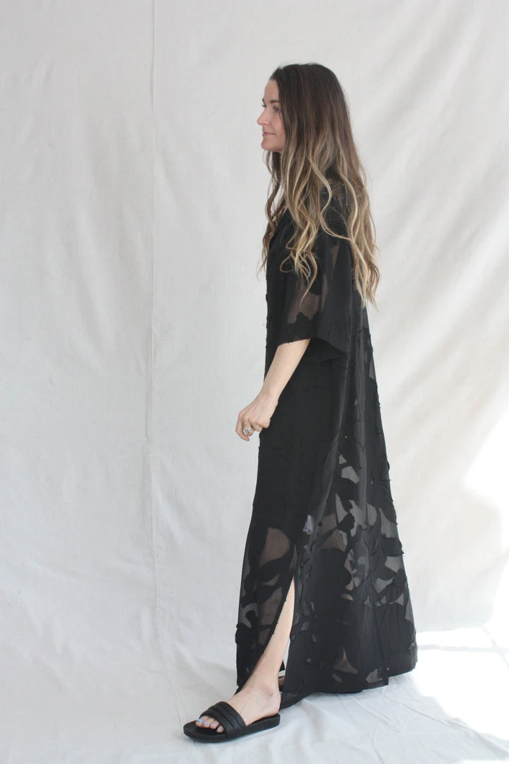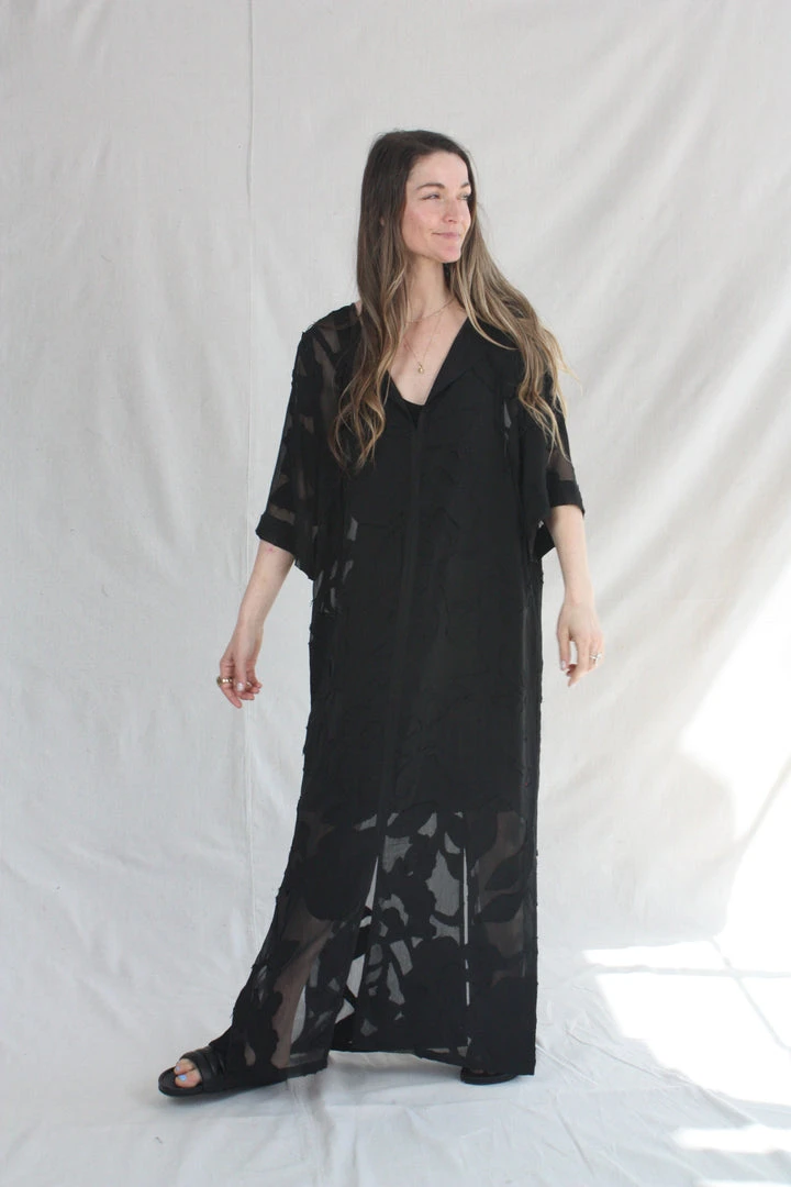 Lynn is a long, oversized dress with regular shoulders and elbow length sleeves. Ties at the neck and slits on both side seams and center front to create a comfy and minimalistic look. The sheer fabric is decorated with beautiful, stitched flower patches all over the dress. It’s made of recycled viscose and polyester fabric from an Italian mill.Â