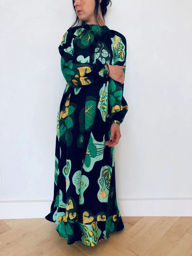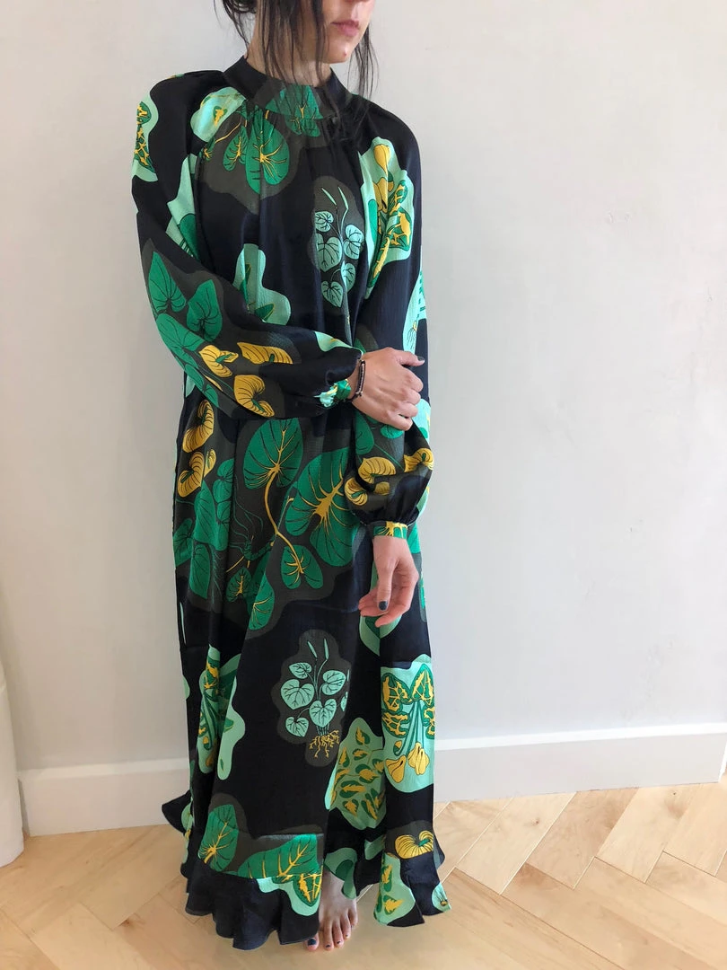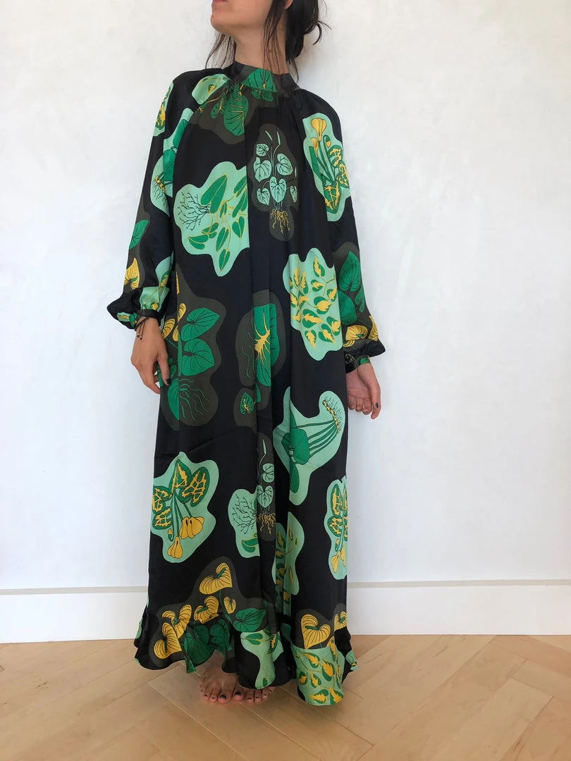Oversized maxi dress is cut in 100% soft silk and features this season’s love plant print, inspired by Georgia O’Keefes passionate studies and paintings of plants. Expressive frill along bottom hem, relaxed flowy fit, keyhole opening in the back, wide sleeves, and slightly textured fabric.
