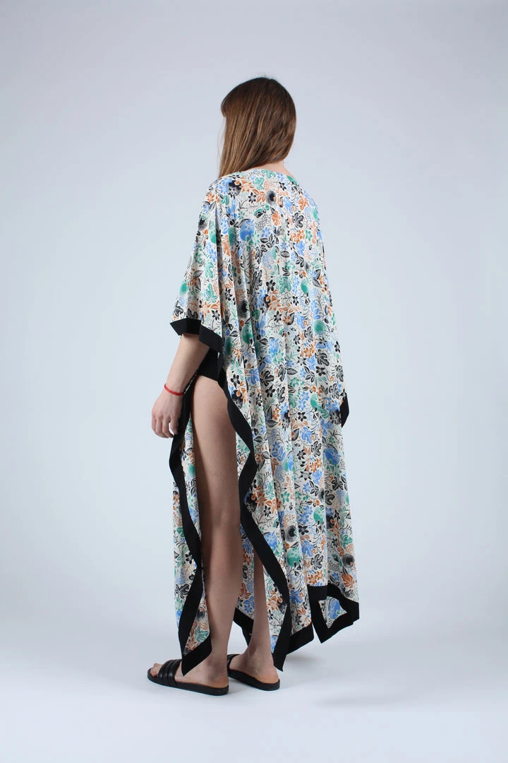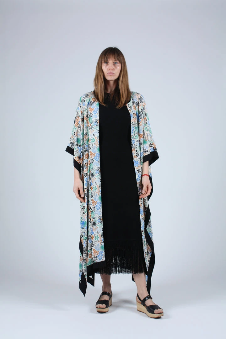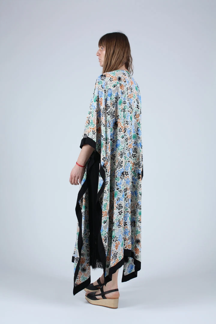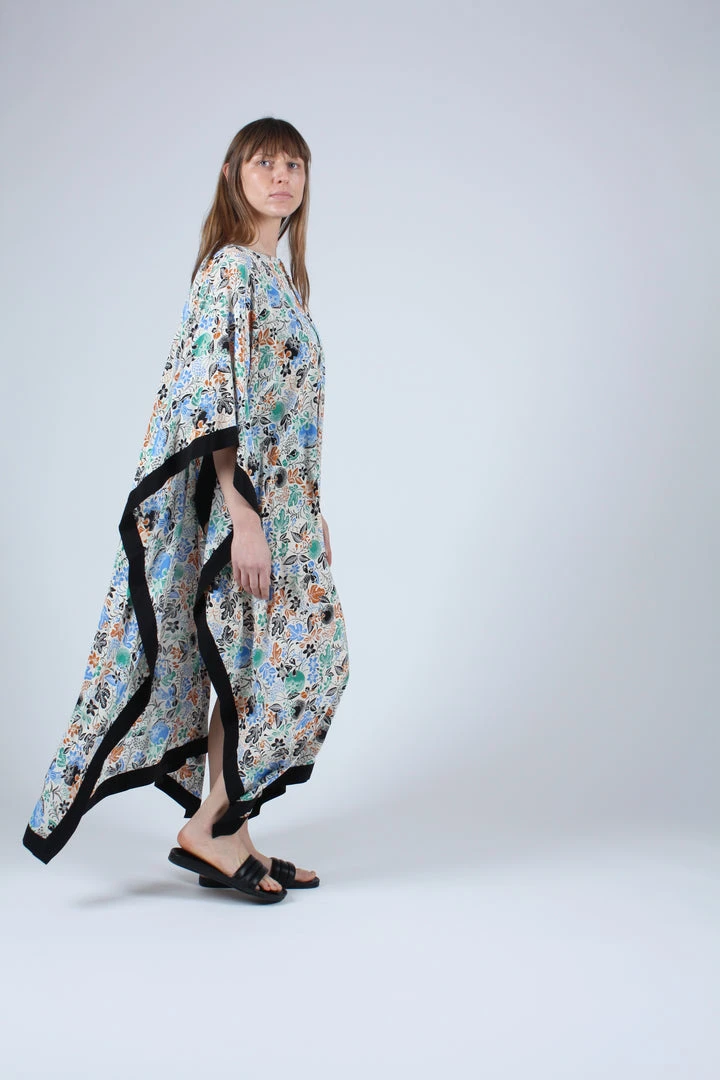 Nalu is a squared, voluminous floorlength cape in an original print from the Rodebjer studio, with inspiration drawn from a Moroccan garden. It has a hook-and-eye button front.