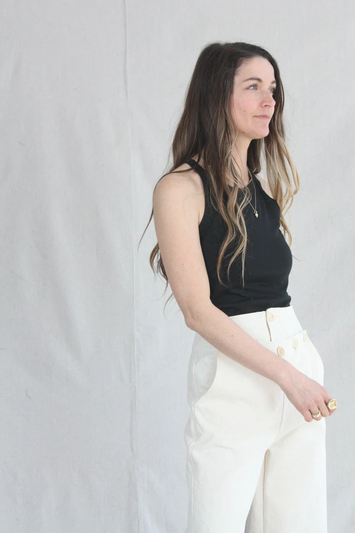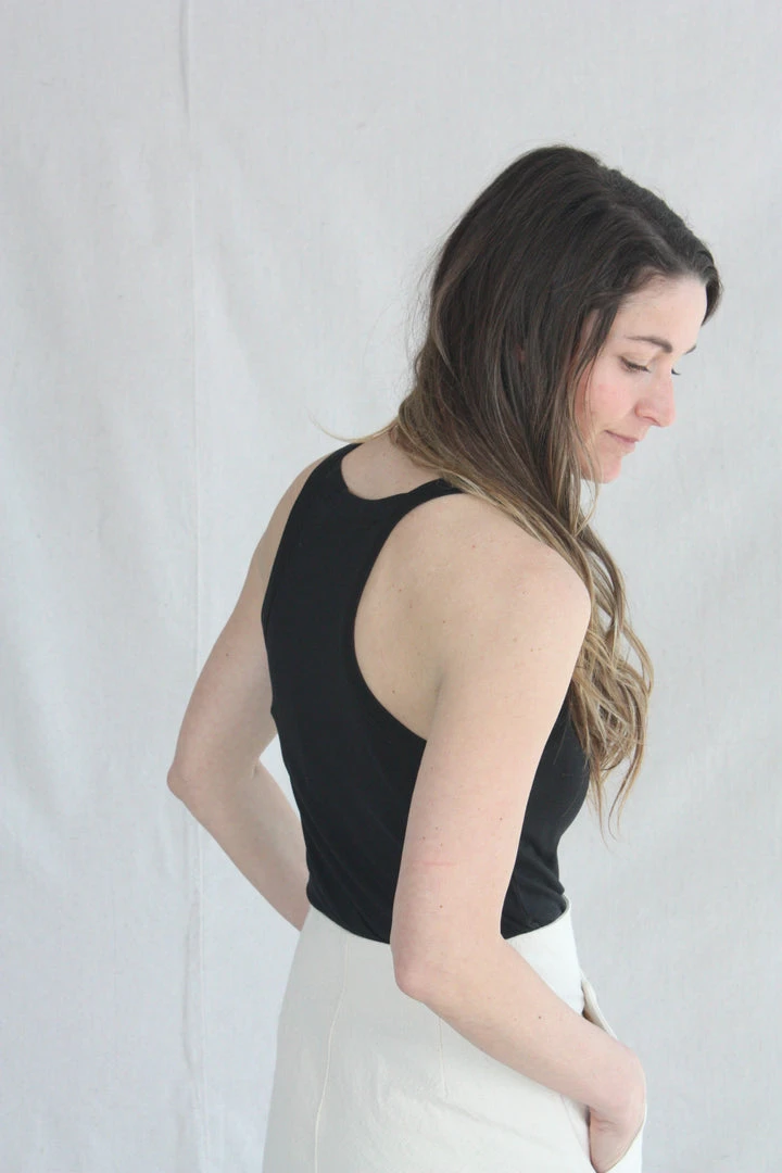Oana is a go-to tank top with exposed shoulders and a racer back. Structured jersey and exaggerated seams add an elevated element.Â