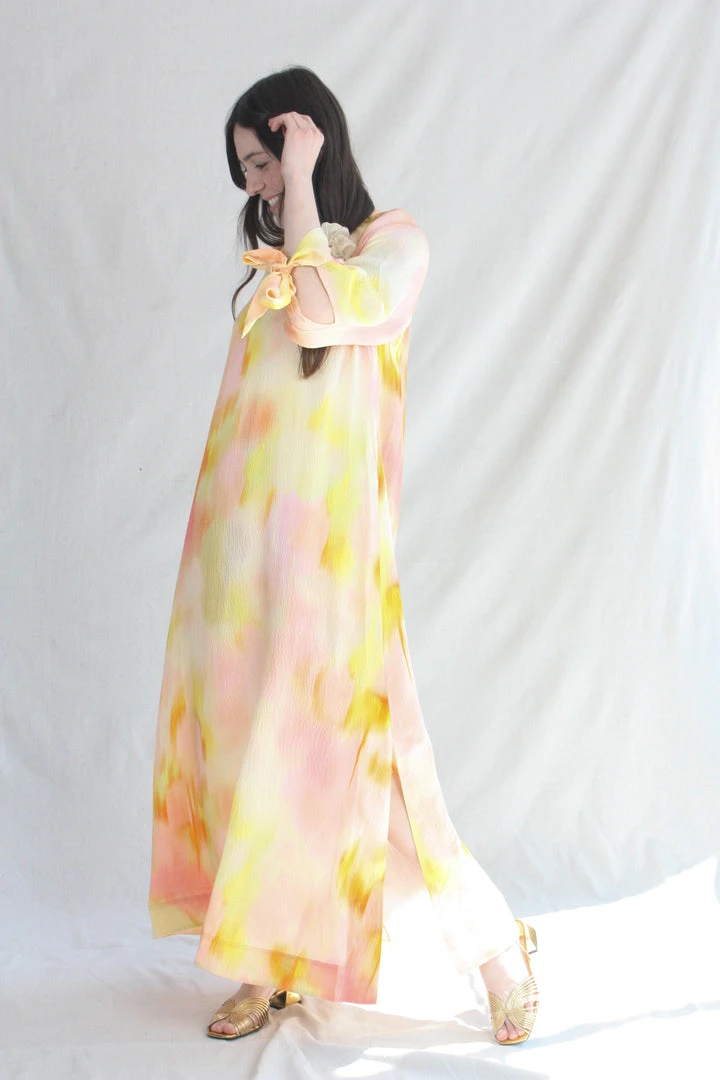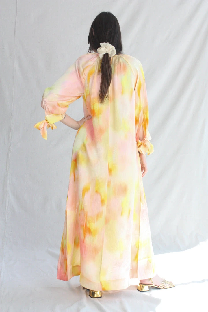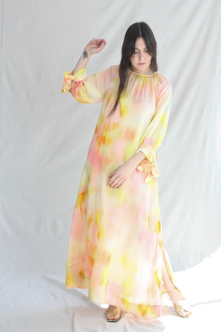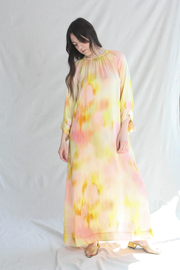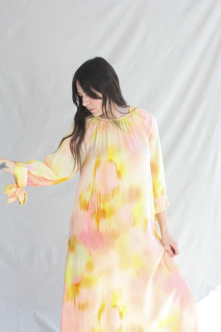 Wava Waterfloral is an oversized dress made in a hammered silk with a water color floral print. Cropped3/4 sleeve with tie cuffs. The dress has slits at sides which give the dress a lively movement and hits at ankle length. This is truly a real statement piece.
