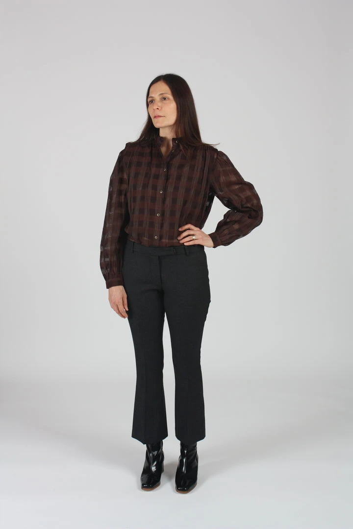 Long sleeve button front top with blouson sleeves.