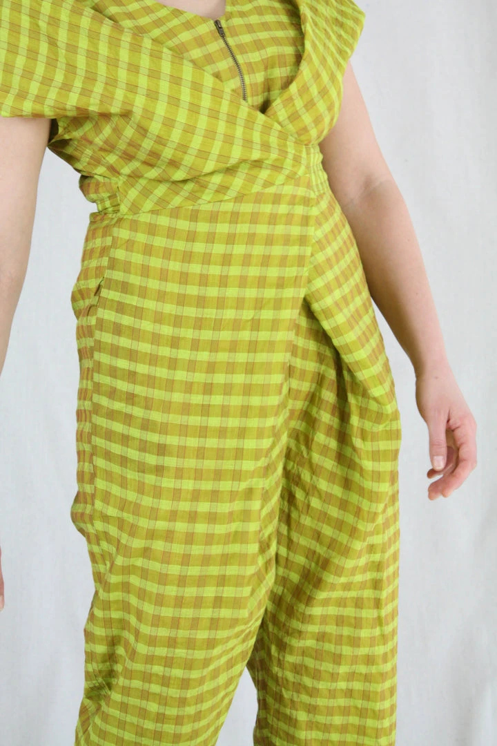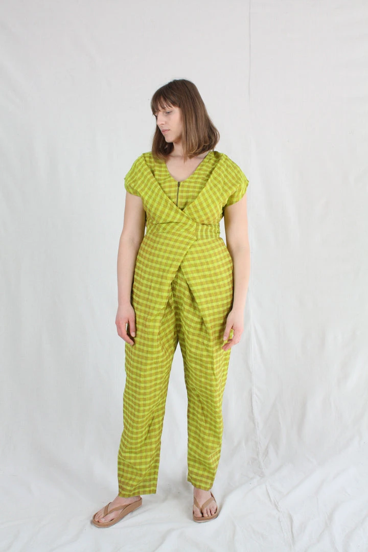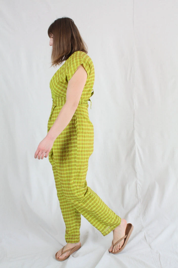 Short-sleeve jumper with wrap waist that can be tied in the front or back. Placket buttons up the front. Features hidden side pockets. Fits loosely but can be cinched at the waist as per body measurement or comfort! Bottom hem tapers for a sleek look and hem falls above the ankle.