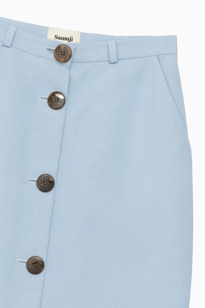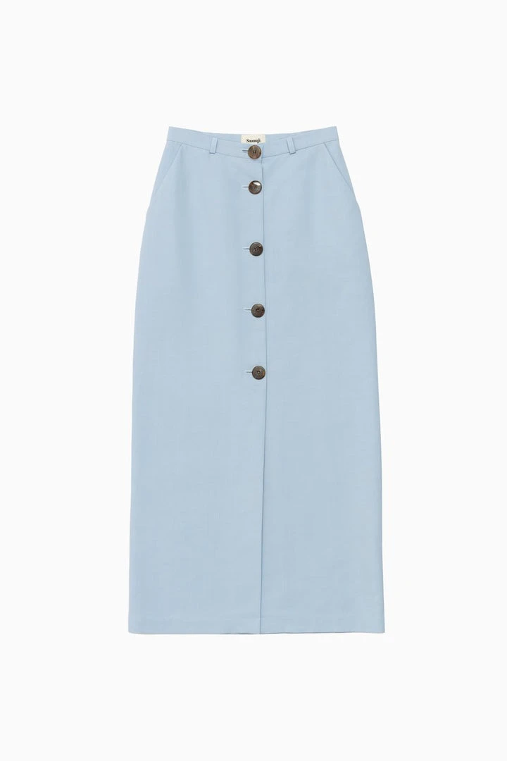 The Boipello Skirt is a fresh take of the classic pencil skirt, made from a light blue cotton blend. This ankle length and straight cut skirt has a button front, belt loops and side slit pockets.