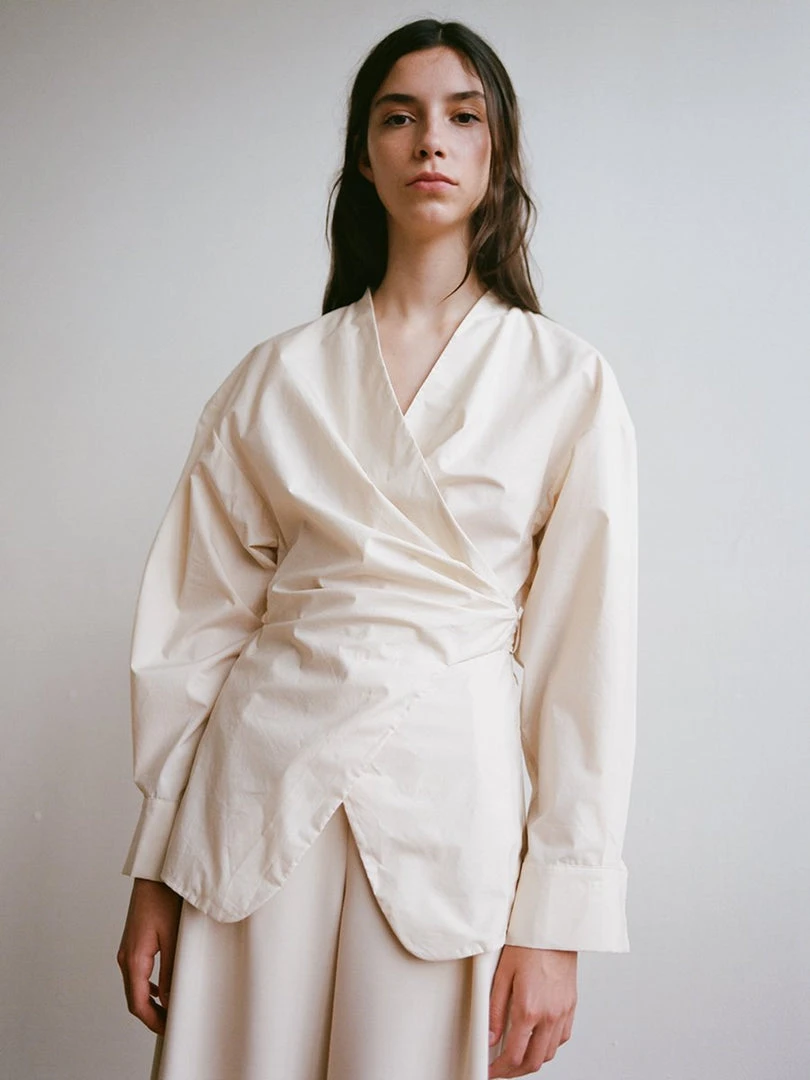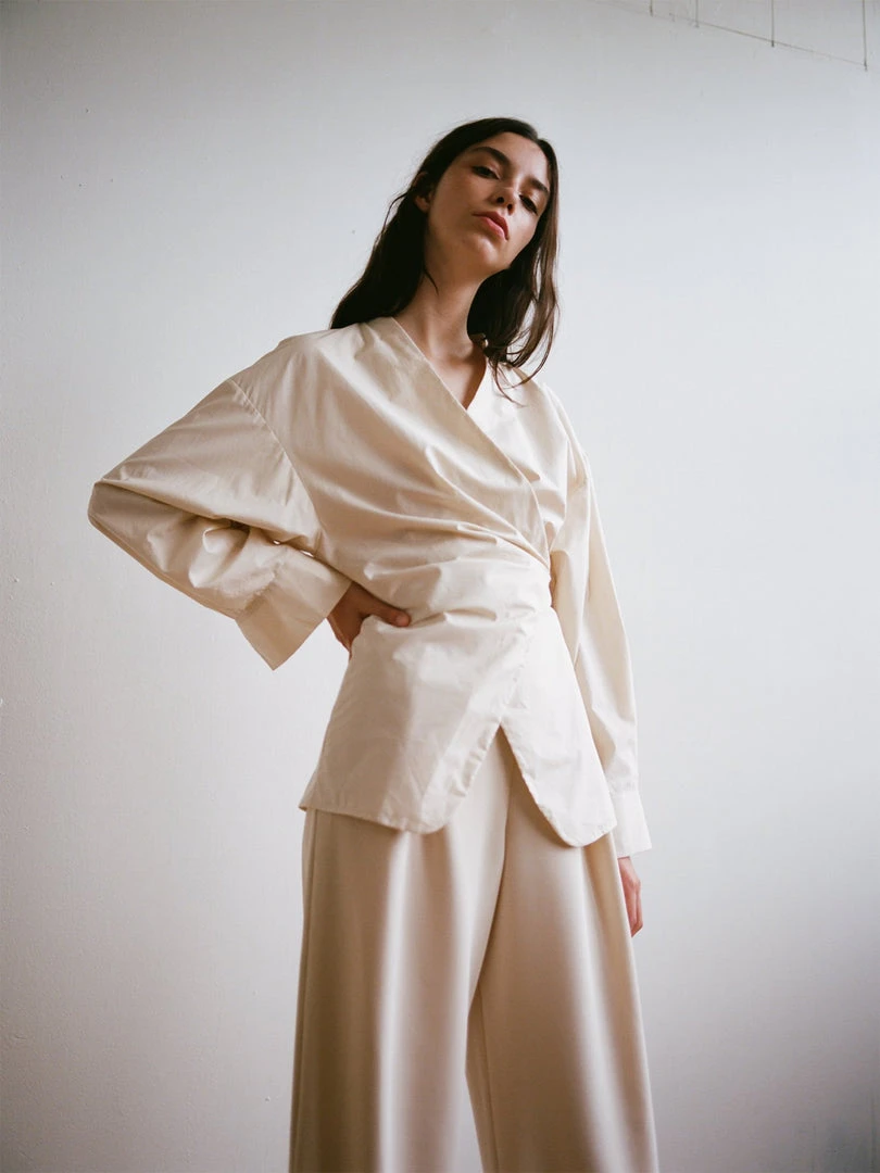 A softly draped wrapping top with wide boxy shoulders. Shirting inspired sleeve with pleat and cuff at hem. Made in a crisp cotton poplin. Designed with intention to last for years to come, all seams are dually reinforced french seams.