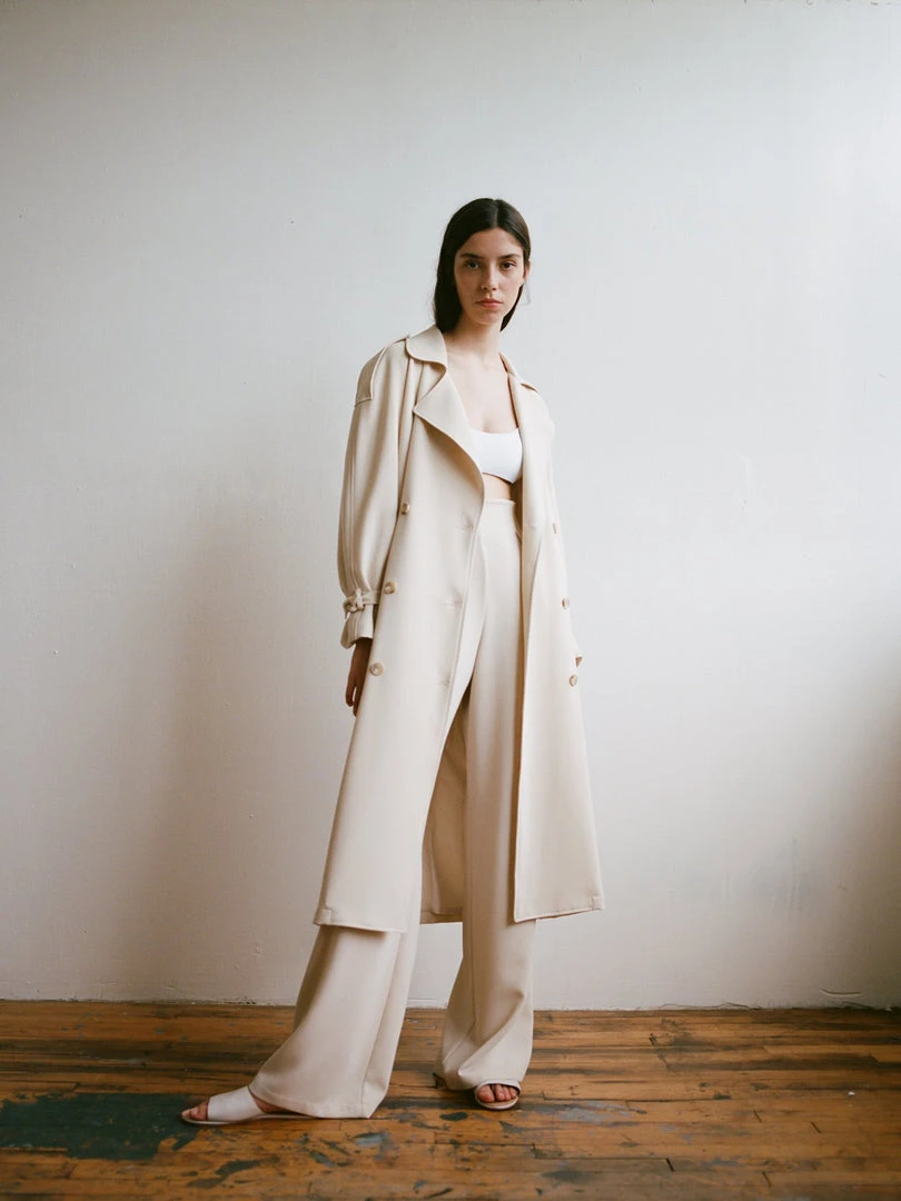 The Rumi Trouser is an elegant, high waist pant with deep front pleat. Wide leg opening, invisible zipper entry at center back. Made of heavy crepe.