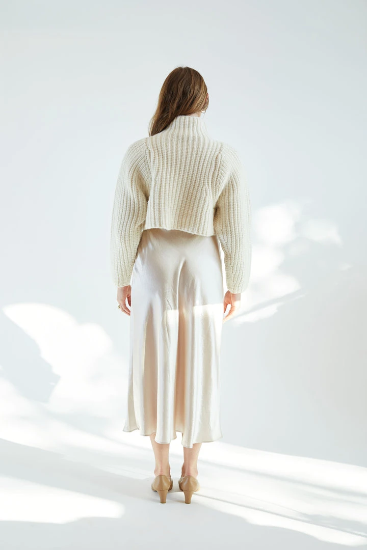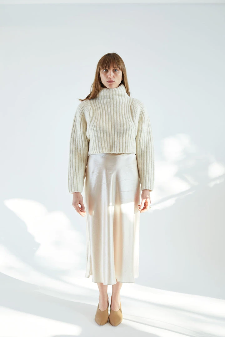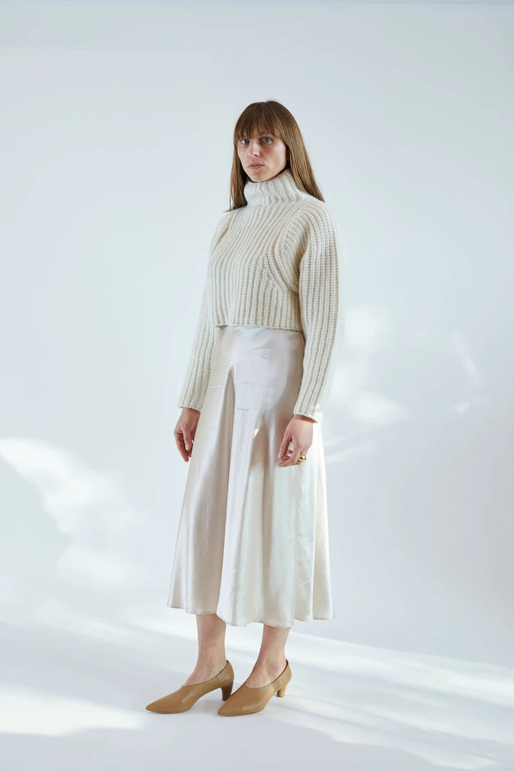 The Naropa Skirt is a bias cut slip style skirt in satin with size zip entry.