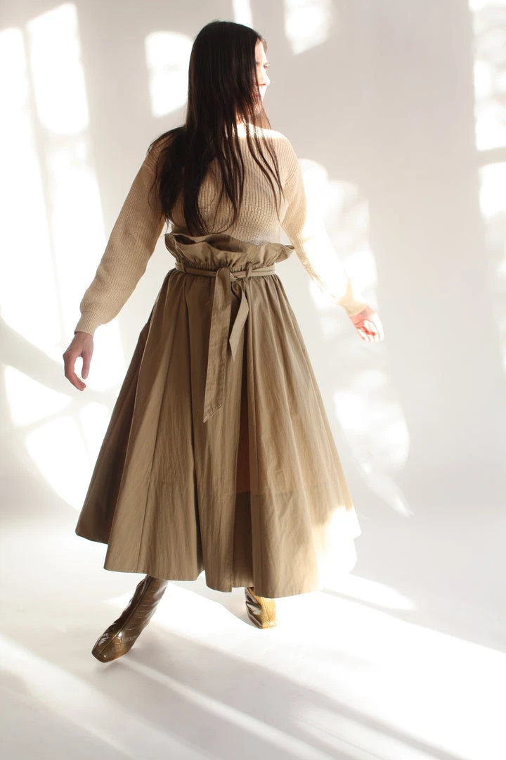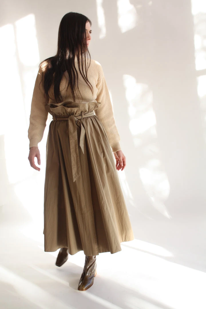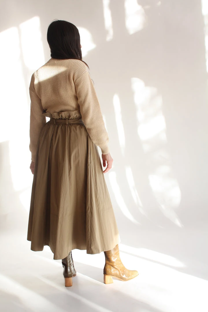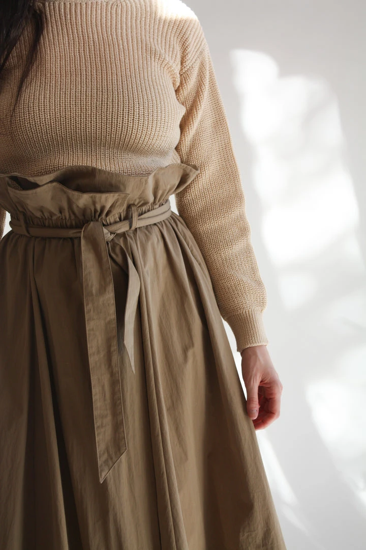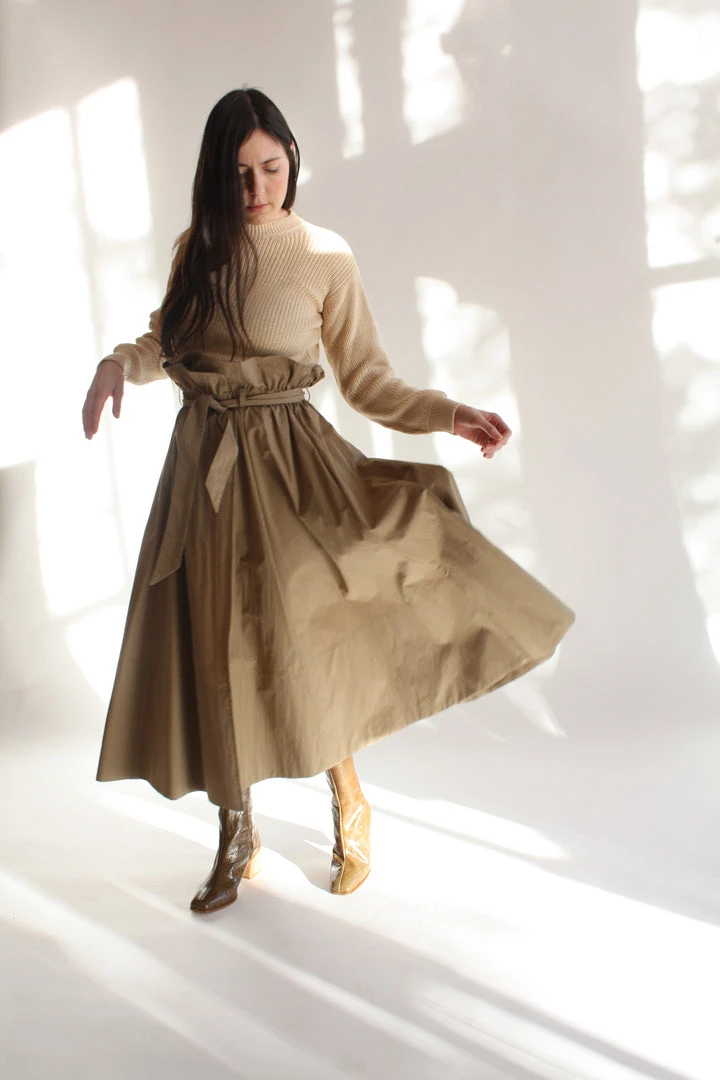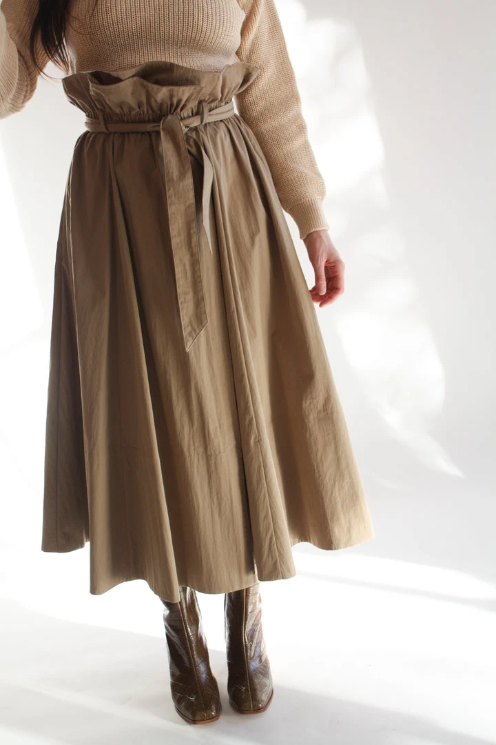 Voluminous wrap skirt with paper bag elastic waist. Thick hem, full skirt, hits mid calf. Side seam pockets and belt.